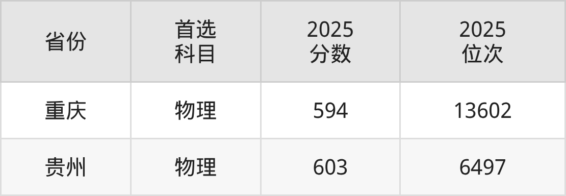 物理类最低分对应地区为重庆,录取位次为13602,超本科线169分;最高分对应地区为贵州,录取位次为6497,超本科线216分。