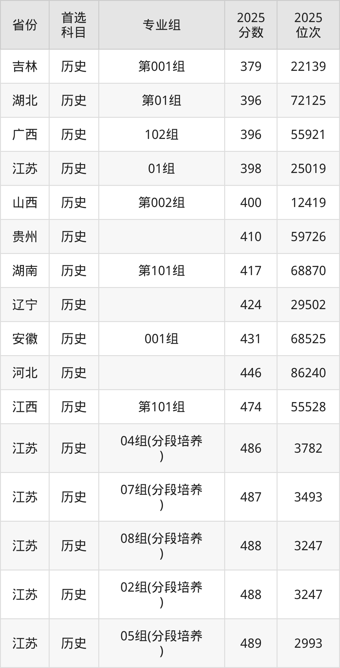 历史类最低分对应地区为吉林(第001组),录取位次为22139,超专科线219分;最高分对应地区为江苏(03组(分段培养)),录取位次为2348,超专科线272分。