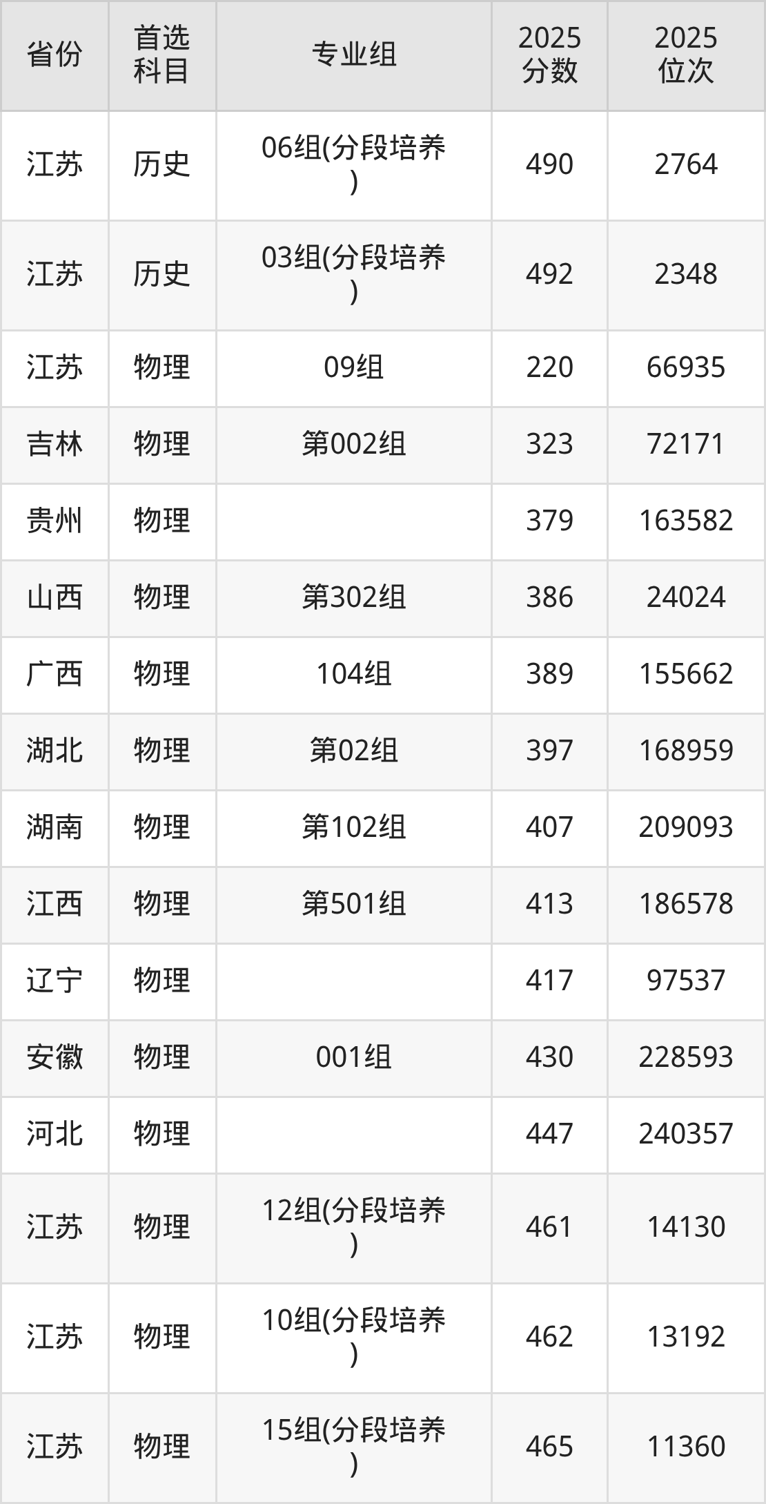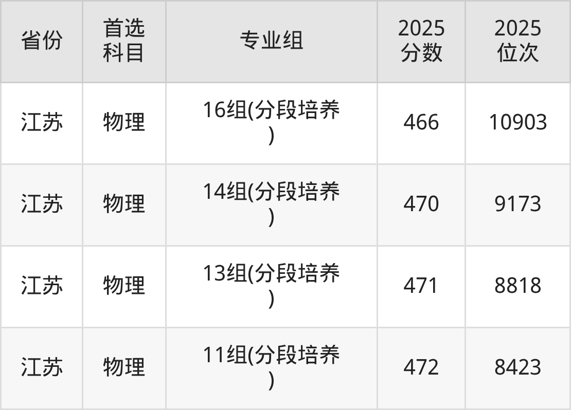 物理类最低分对应地区为江苏(09组),录取位次为66935;最高分对应地区为江苏(11组(分段培养)),录取位次为8423,超专科线252分。