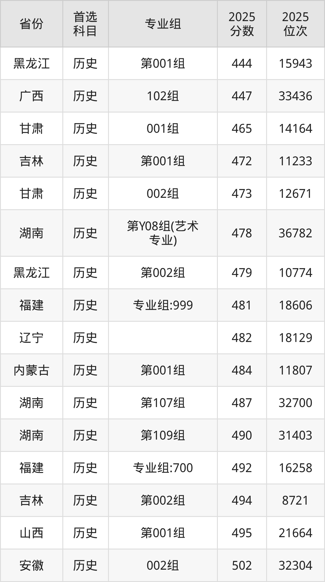 历史类:第107组487分、32700名,第109组490分、31403名,第Y08组(艺术专业)478分、36782名;