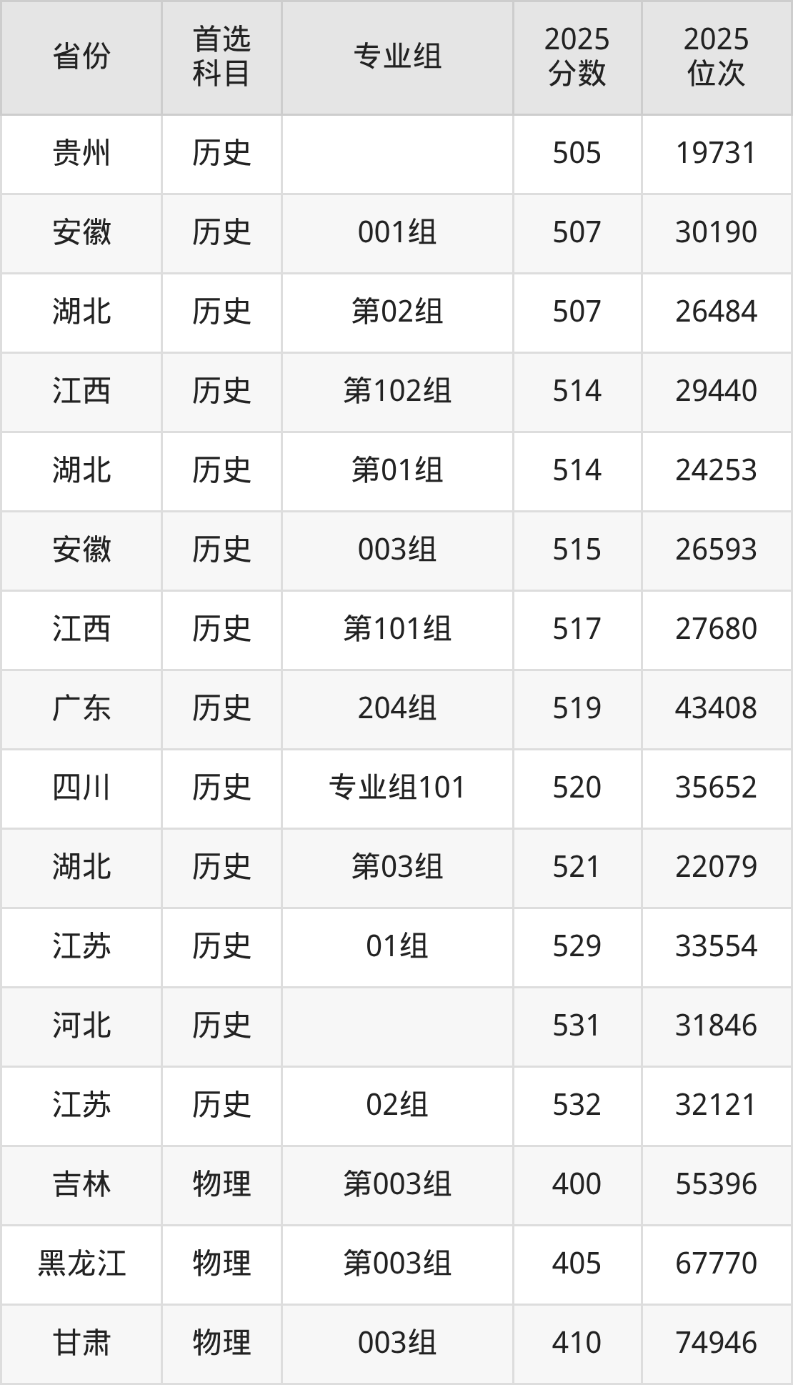 历史类最低分对应地区为黑龙江(第001组),录取位次为15943,超本科线39分;最高分对应地区为江苏(02组),录取位次为32121。