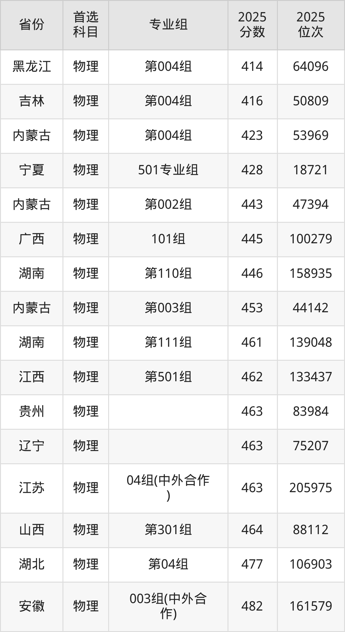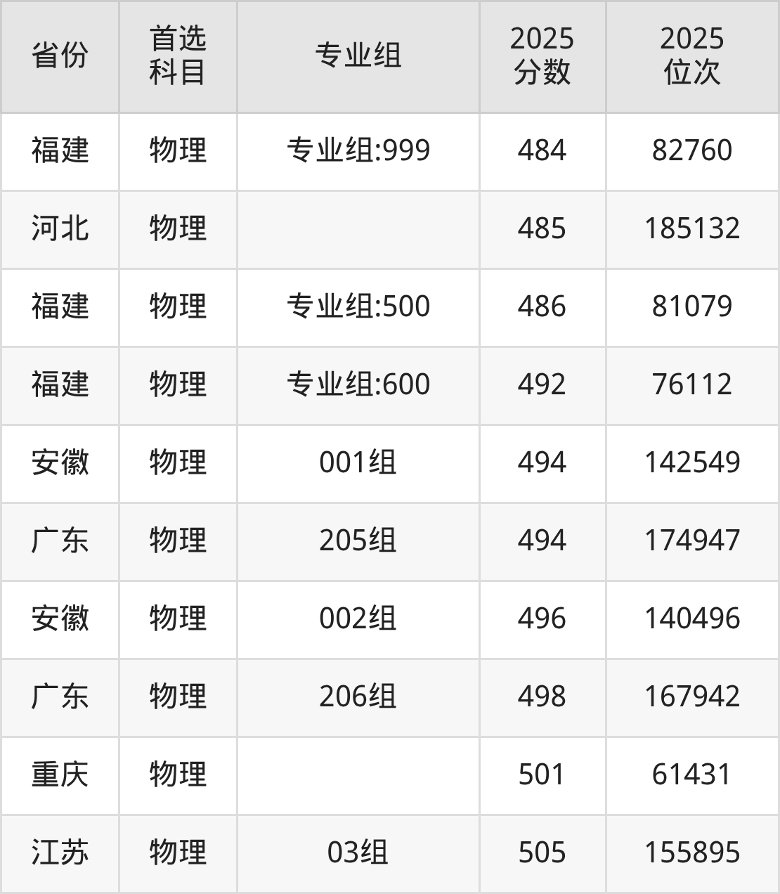 物理类最低分对应地区为吉林(第003组),录取位次为55396;最高分对应地区为江苏(03组),录取位次为155895,超本科线42分。
