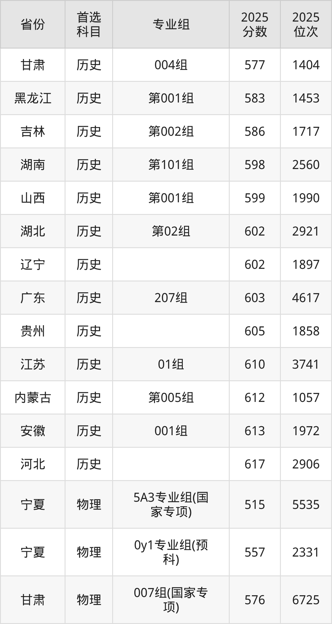 历史类最低分对应地区为甘肃(004组),录取位次为1404,超本科线165分;最高分对应地区为河北,录取位次为2906。