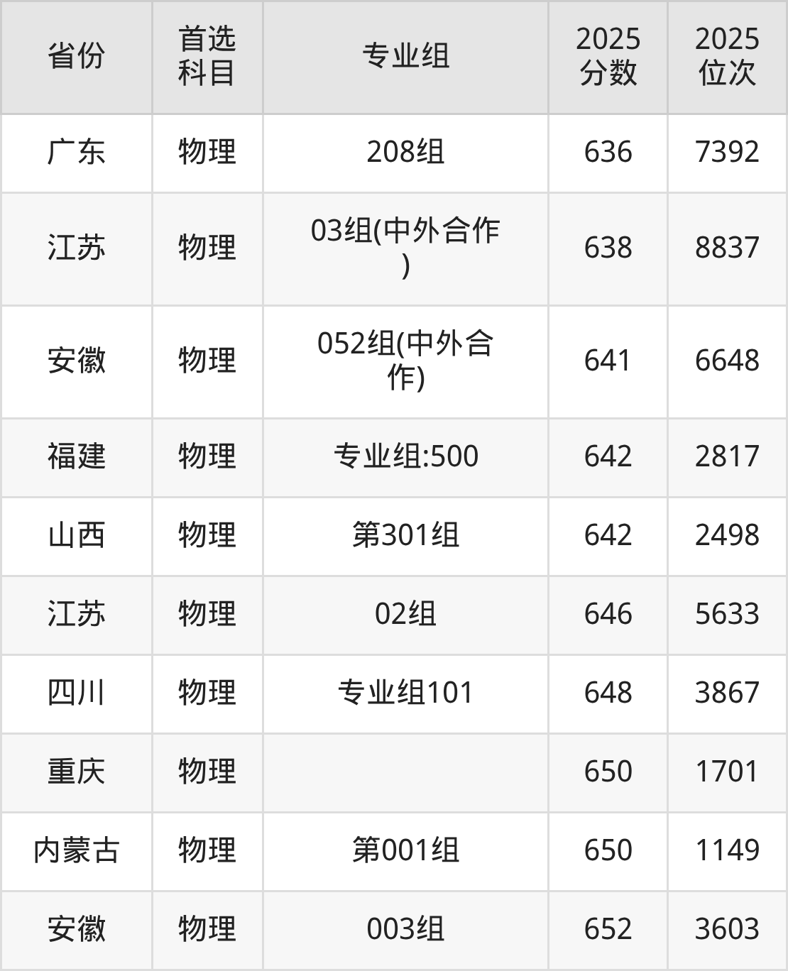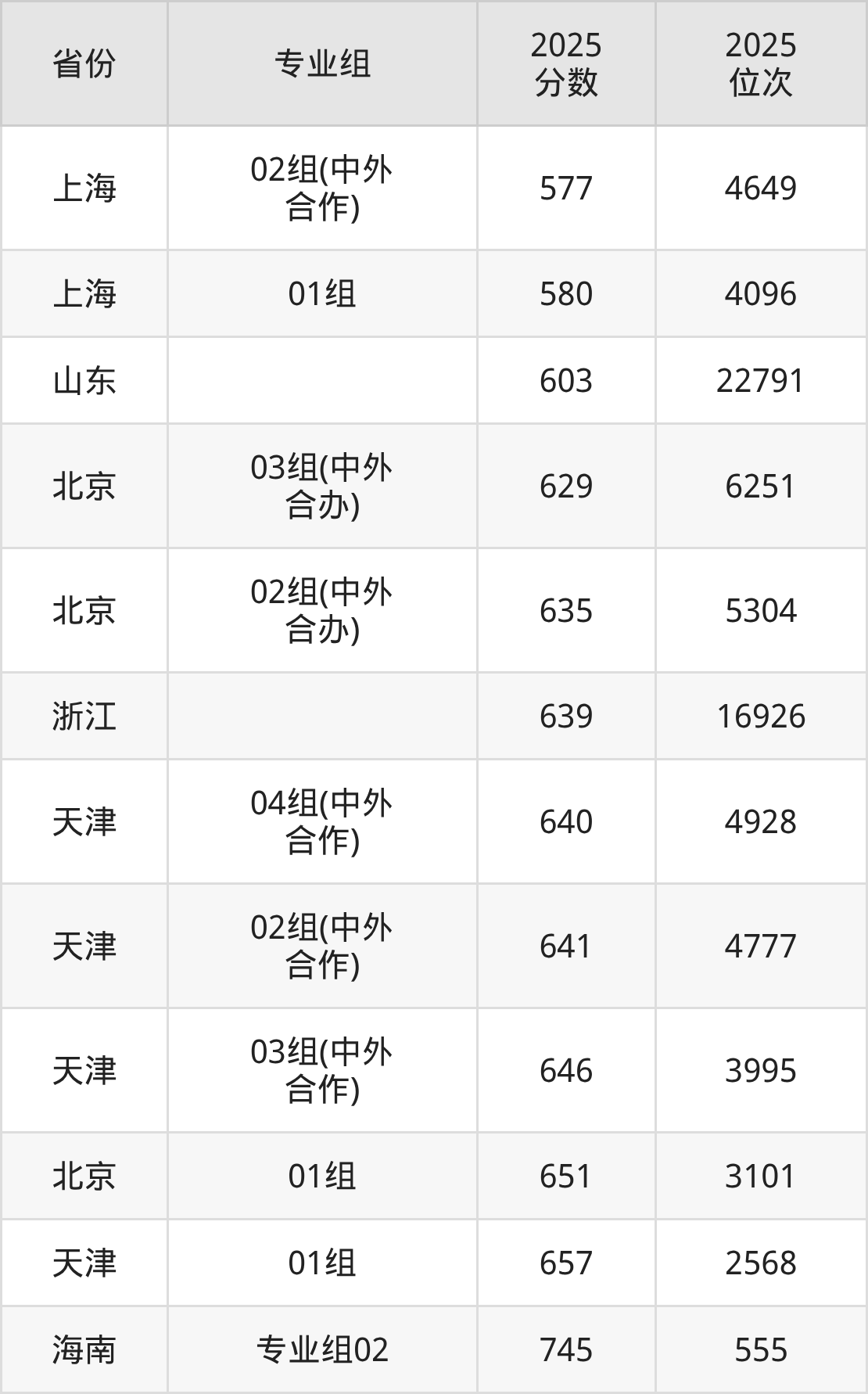 最低分对应地区为上海(02组(中外合作)),录取位次为4649,超本科线175分;最高分对应地区为海南(专业组02),录取位次为555,超本科线265分。