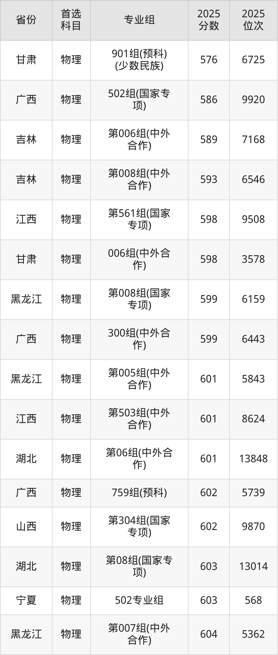 物理类最低分对应地区为宁夏(5A3专业组(国家专项)),录取位次为5535,超本科B143分;最高分对应地区为安徽(003组),录取位次为3603,超本科线191分。