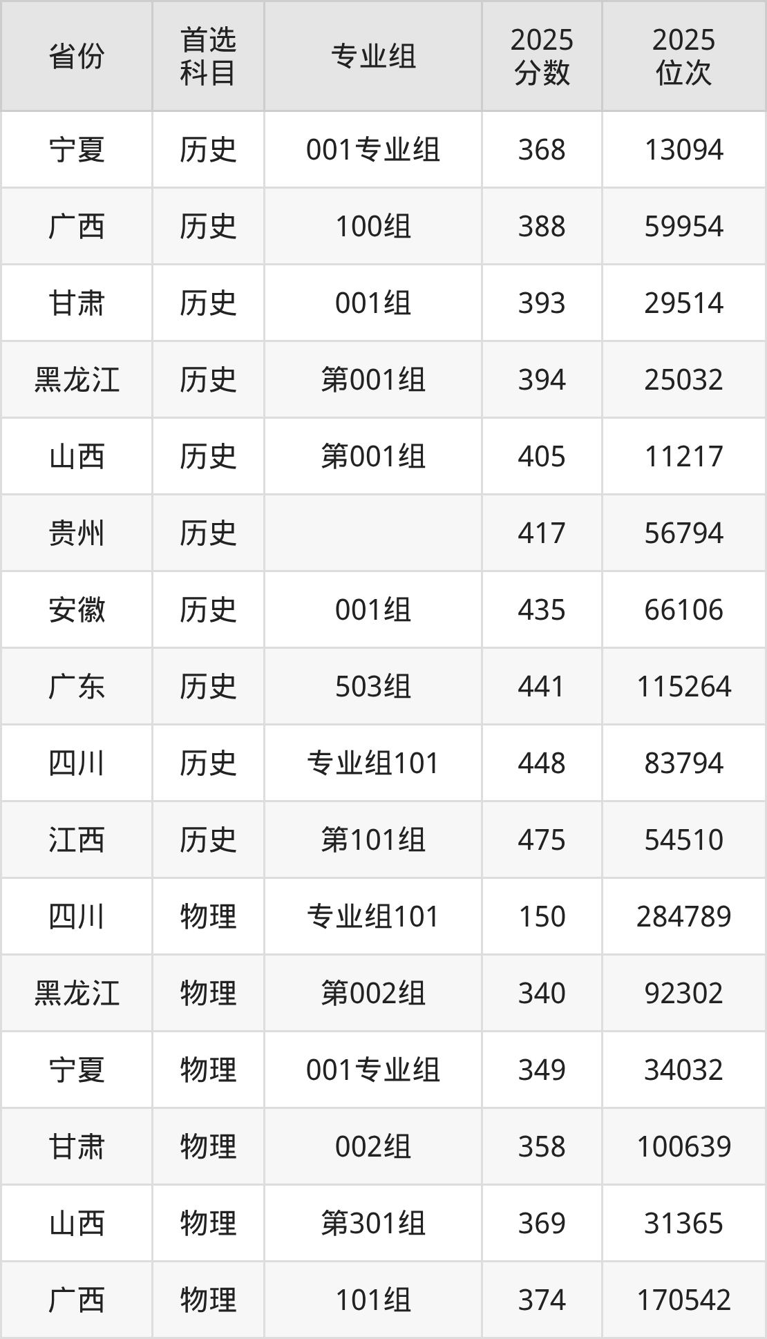 历史类最低分对应地区为宁夏(001专业组),录取位次为13094,超专科线218分;最高分对应地区为江西(第101组),录取位次为54510,超专科线185分。