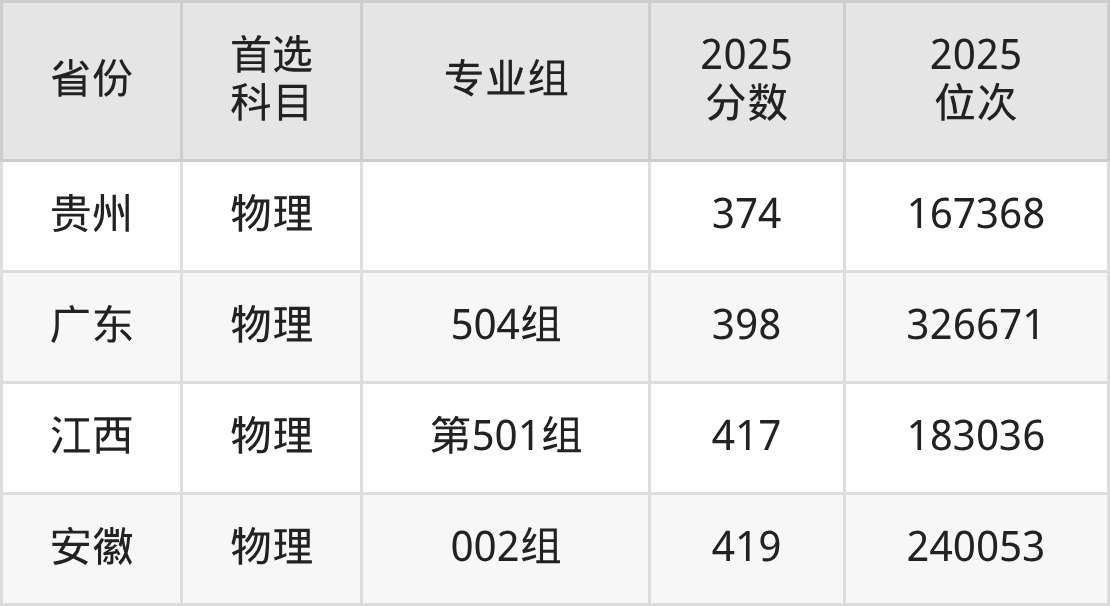 物理类最低分对应地区为四川(专业组101),录取位次为284789;最高分对应地区为安徽(002组),录取位次为240053,超专科线219分。