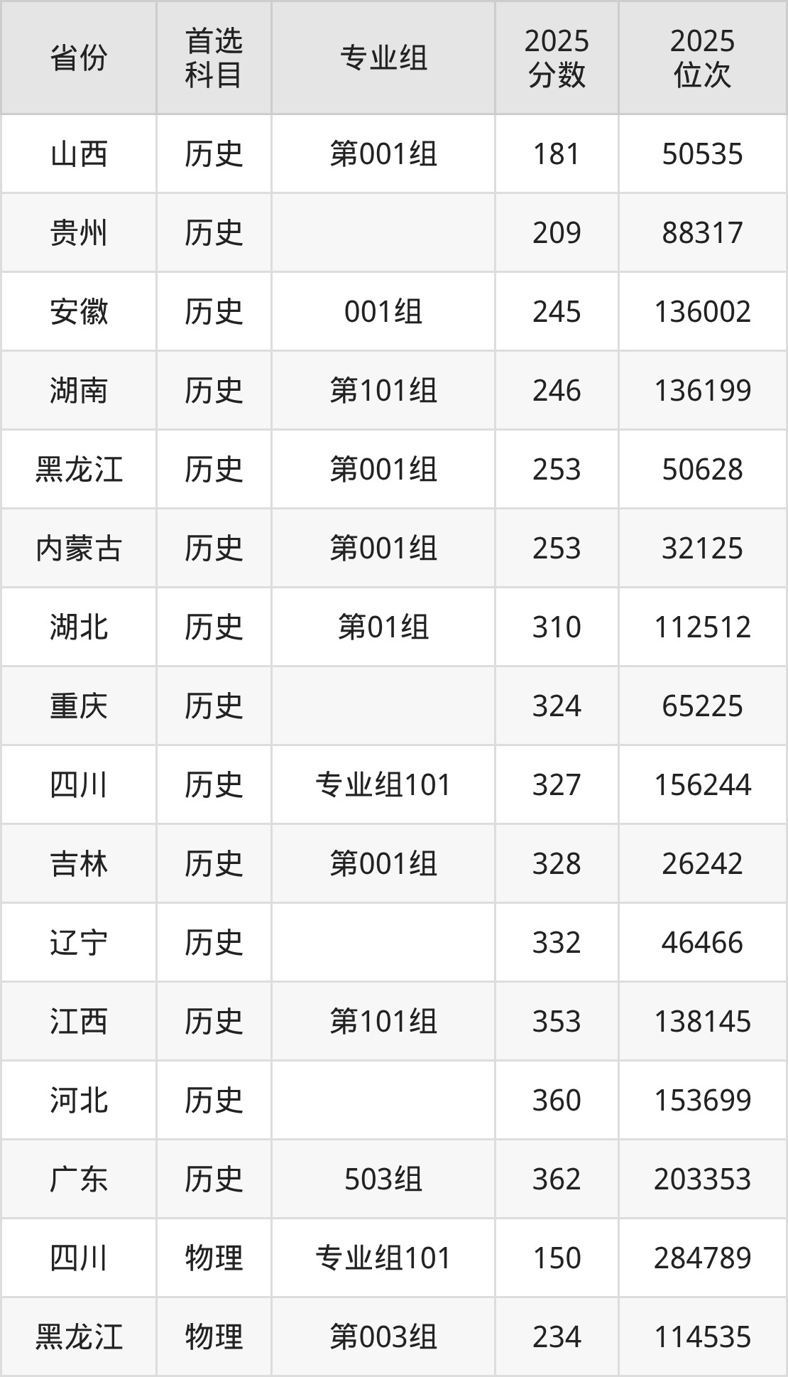 历史类最低分对应地区为山西(第001组),录取位次为50535,超专科线81分;最高分对应地区为广东(503组),录取位次为203353,超专科线147分。