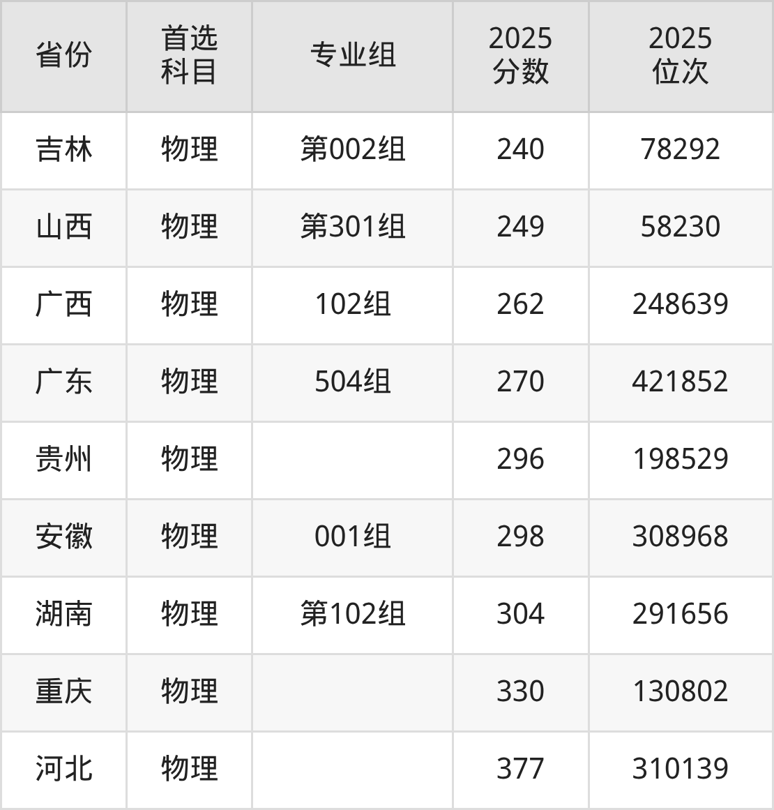 物理类最低分对应地区为四川(专业组101),录取位次为284789;最高分对应地区为河北,录取位次为310139,超专科线177分。