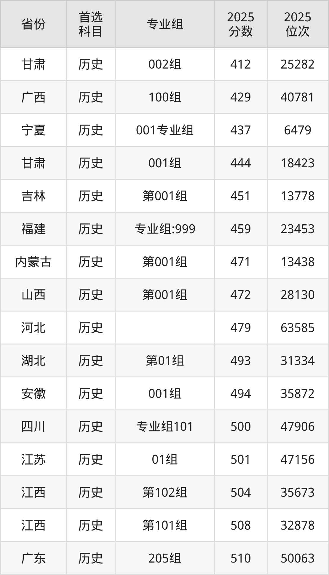 历史类最低分对应地区为甘肃(002组),录取位次为25282;最高分对应地区为广东(205组),录取位次为50063,超本科线46分。