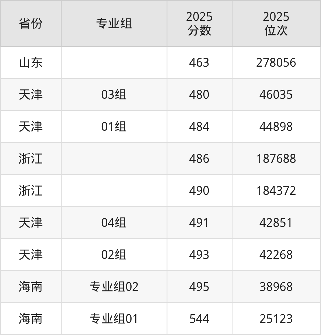 最低分对应地区为山东,录取位次为278056,超一段线54分;最高分对应地区为海南(专业组01),录取位次为25123,超本科线64分。