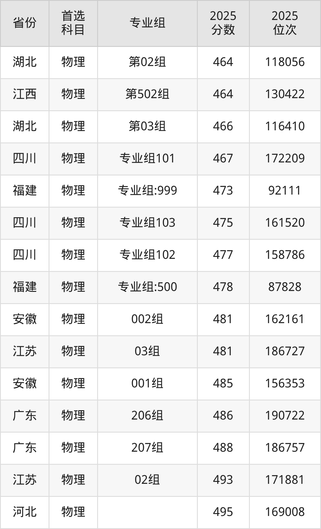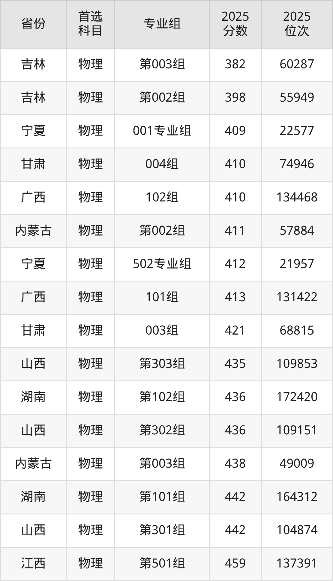 物理类最低分对应地区为吉林(第003组),录取位次为60287,超本科线42分;最高分对应地区为河北,录取位次为169008,超本科线36分。