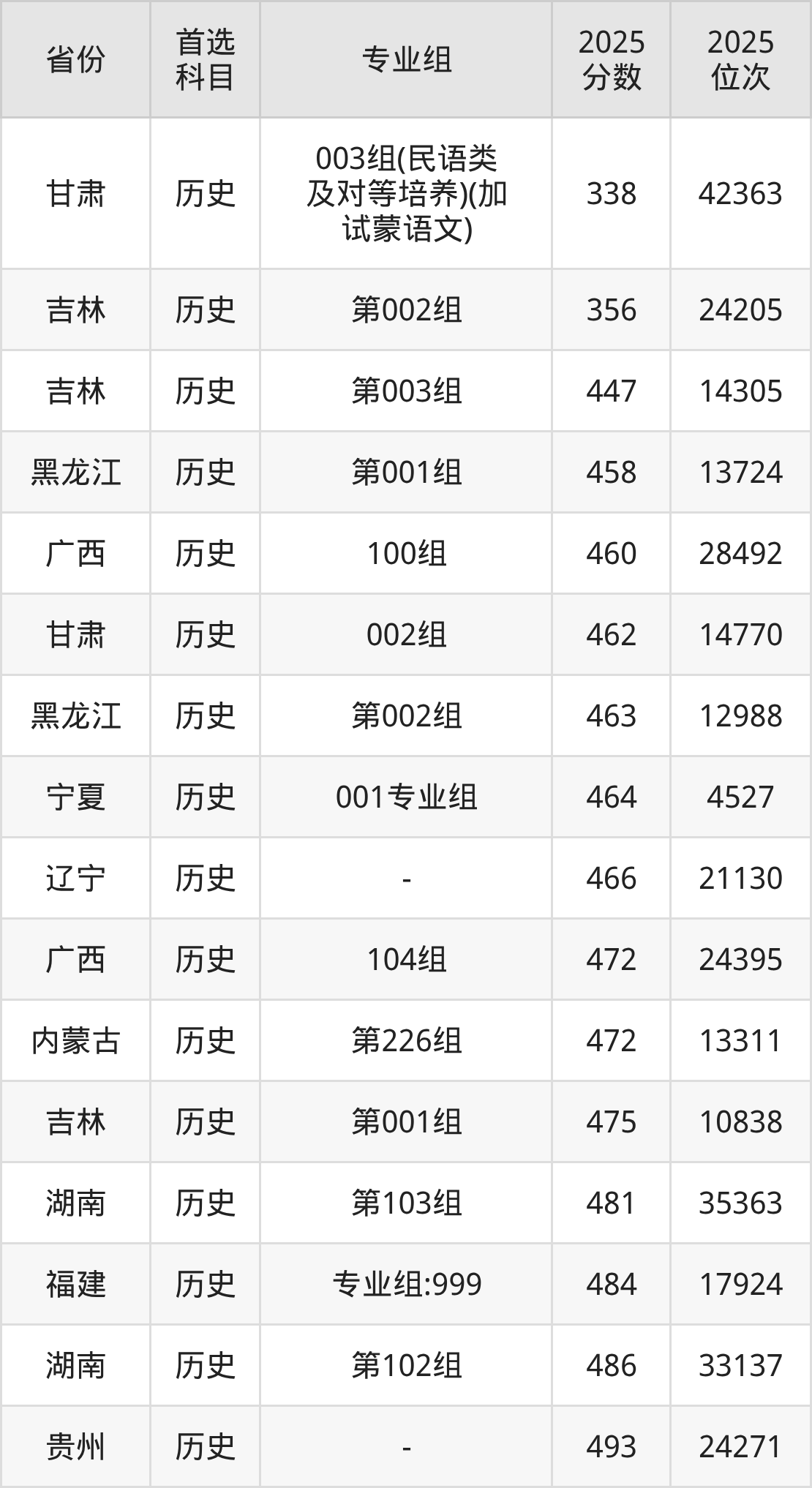 历史类最低分对应地区为甘肃(003组(民语类及对等培养)(加试蒙语文)),录取位次为42363,低本科线74分;最高分对应地区为内蒙古(第888组),录取位次为4087,超本科线141分。