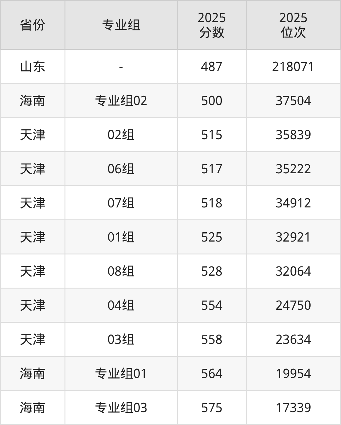 最低分对应地区为山东,录取位次为218071,超一段线73分;最高分对应地区为海南(专业组03),录取位次为17339,超本科线95分。