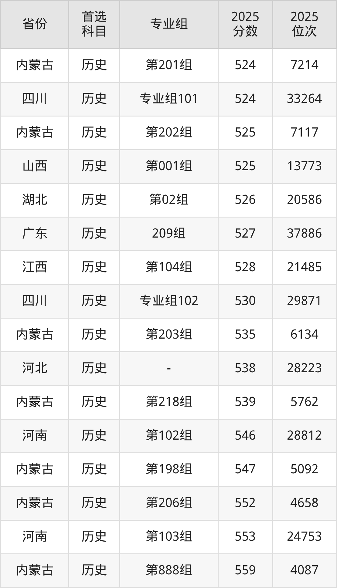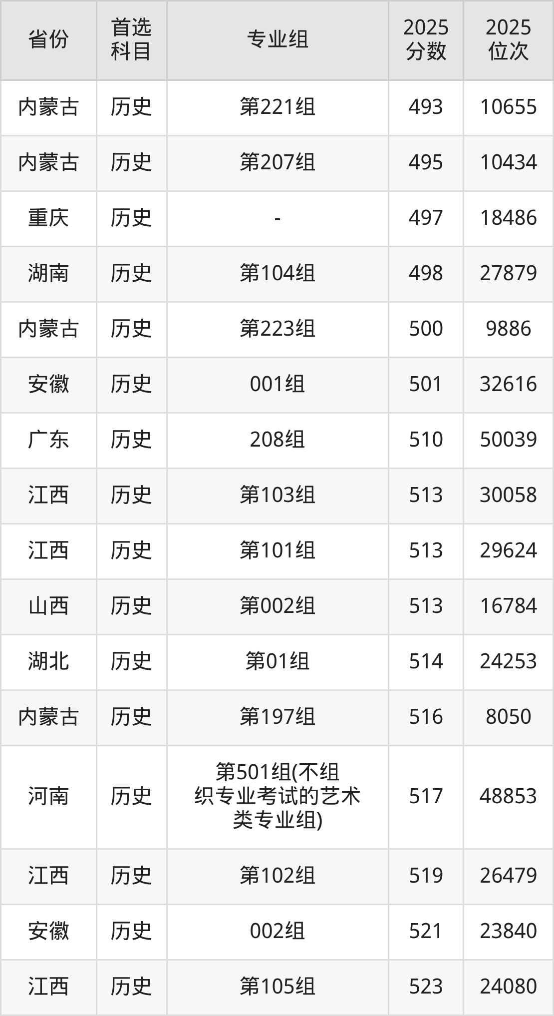 历史类:第197组516分、8050名,第198组547分、5092名,第201组524分、7214名,第202组525分、7117名,第203组535分、6134名,第206组552分、4658名,第207组495分、10434名,第218组539分、5762名,第221组493分、10655名,第223组500分、9886名,第226组472分、13311名,第888组559分、4087名;