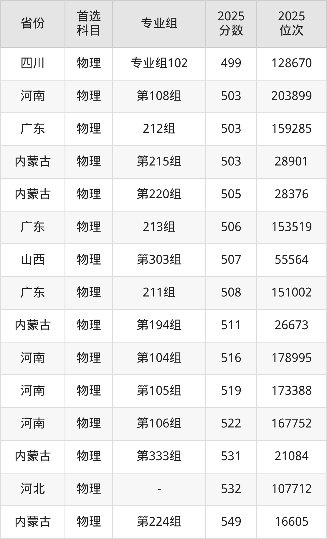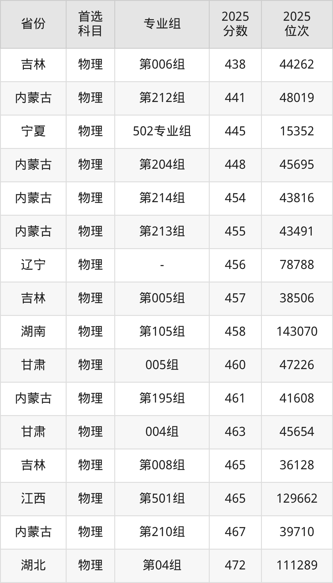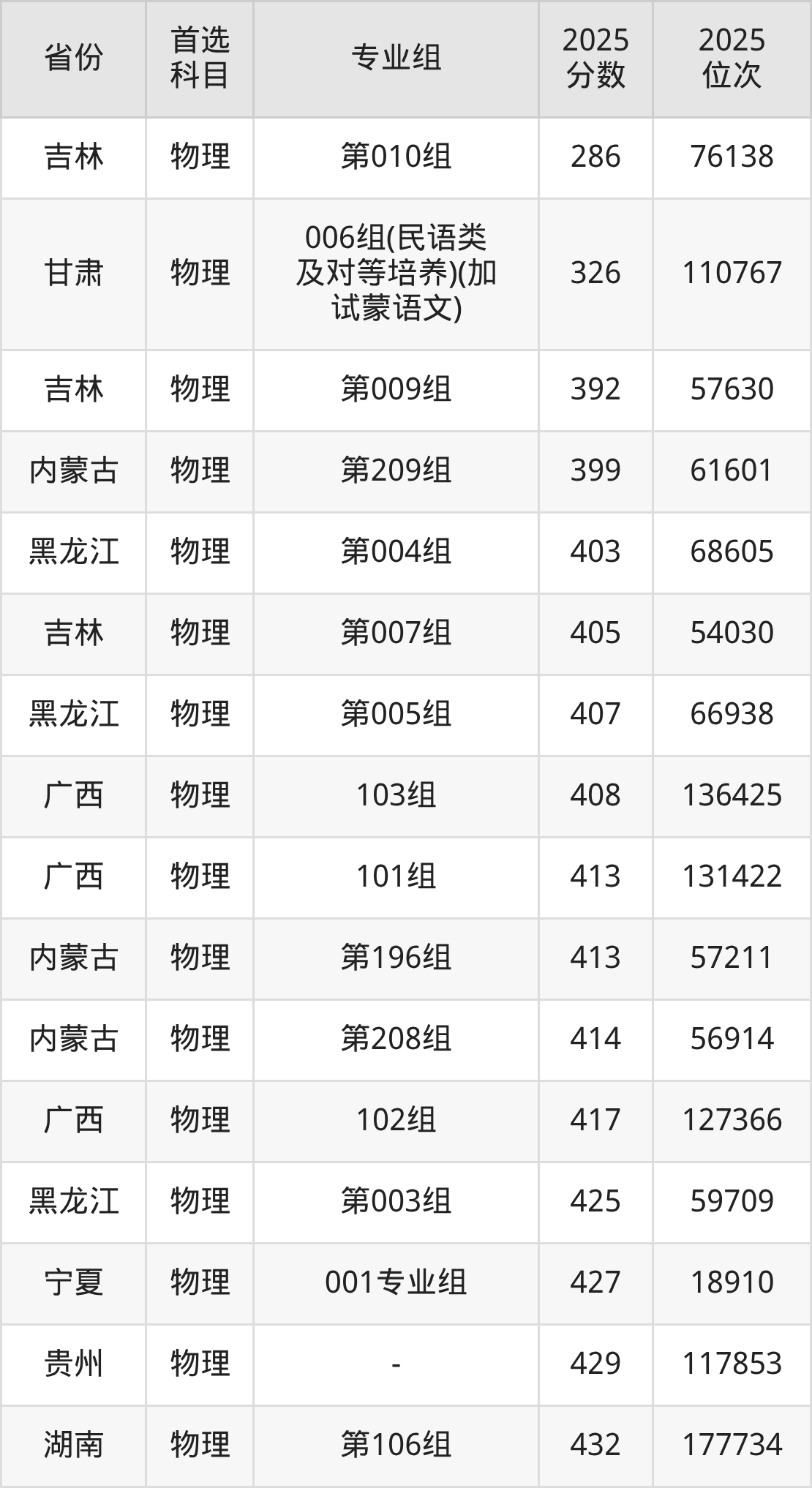 物理类最低分对应地区为吉林(第010组),录取位次为76138,低本科线54分;最高分对应地区为内蒙古(第224组),录取位次为16605,超本科线174分。