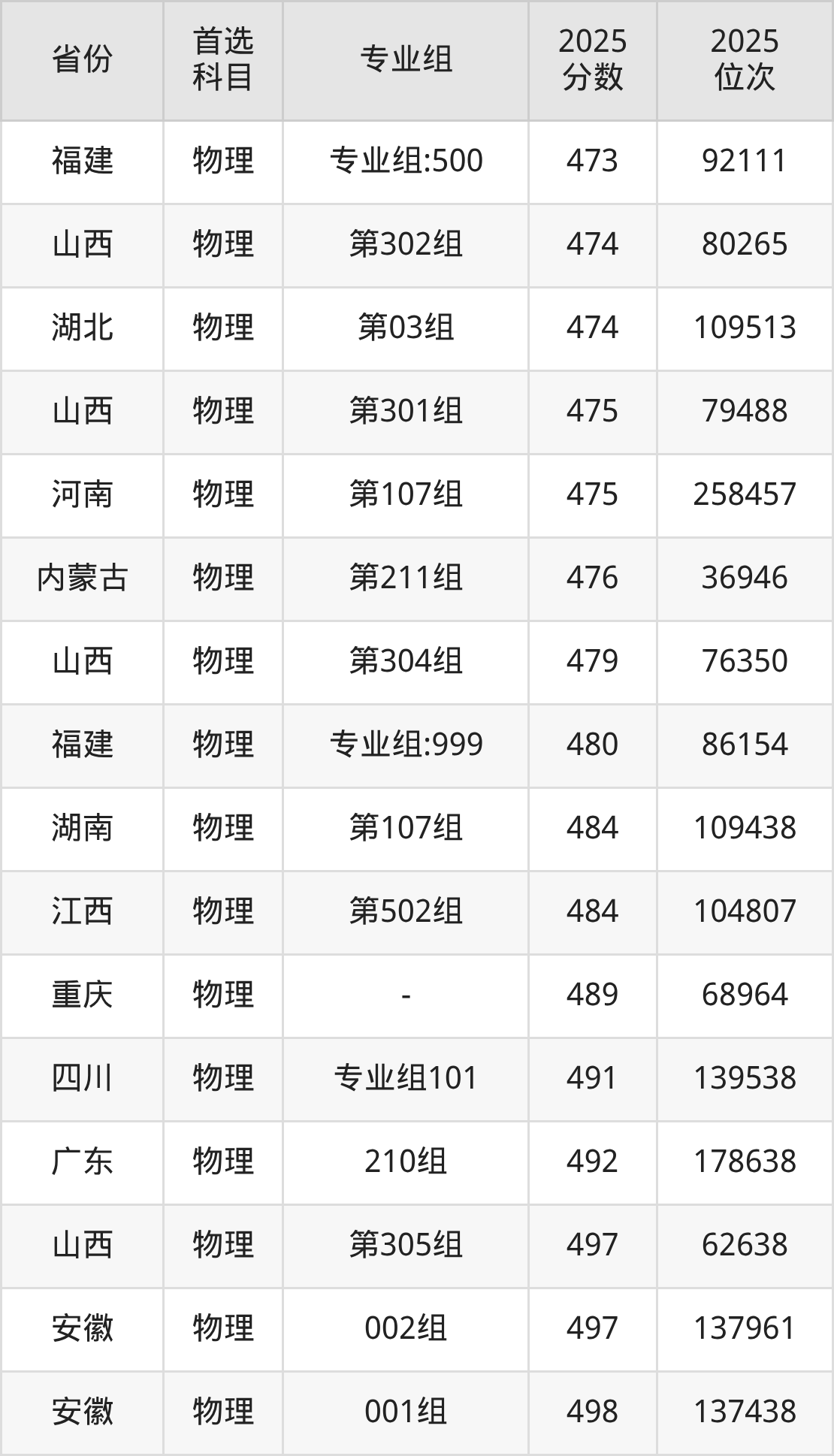 物理类:第194组511分、26673名,第195组461分、41608名,第196组413分、57211名,第204组448分、45695名,第208组414分、56914名,第209组399分、61601名,第210组467分、39710名,第211组476分、36946名,第212组441分、48019名,第213组455分、43491名,第214组454分、43816名,第215组503分、28901名,第220组505分、28376名,第224组549分、16605名,第333组531分、21084名;