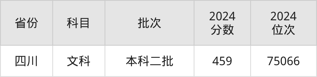 文科最低分对应地区为四川,录取位次为75066,超二本线2分。