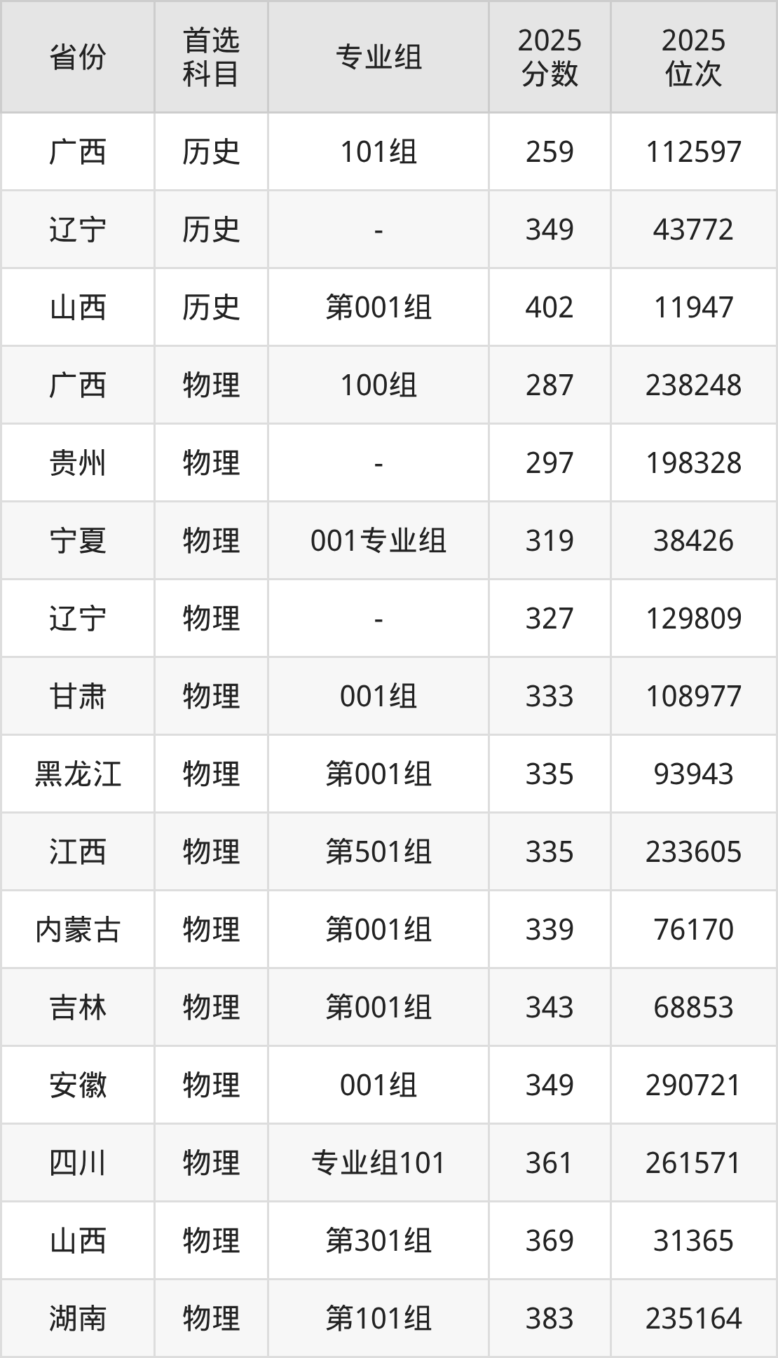 历史类最低分对应地区为广西(101组),录取位次为112597,超专科线59分;最高分对应地区为山西(第001组),录取位次为11947,超专科线302分。