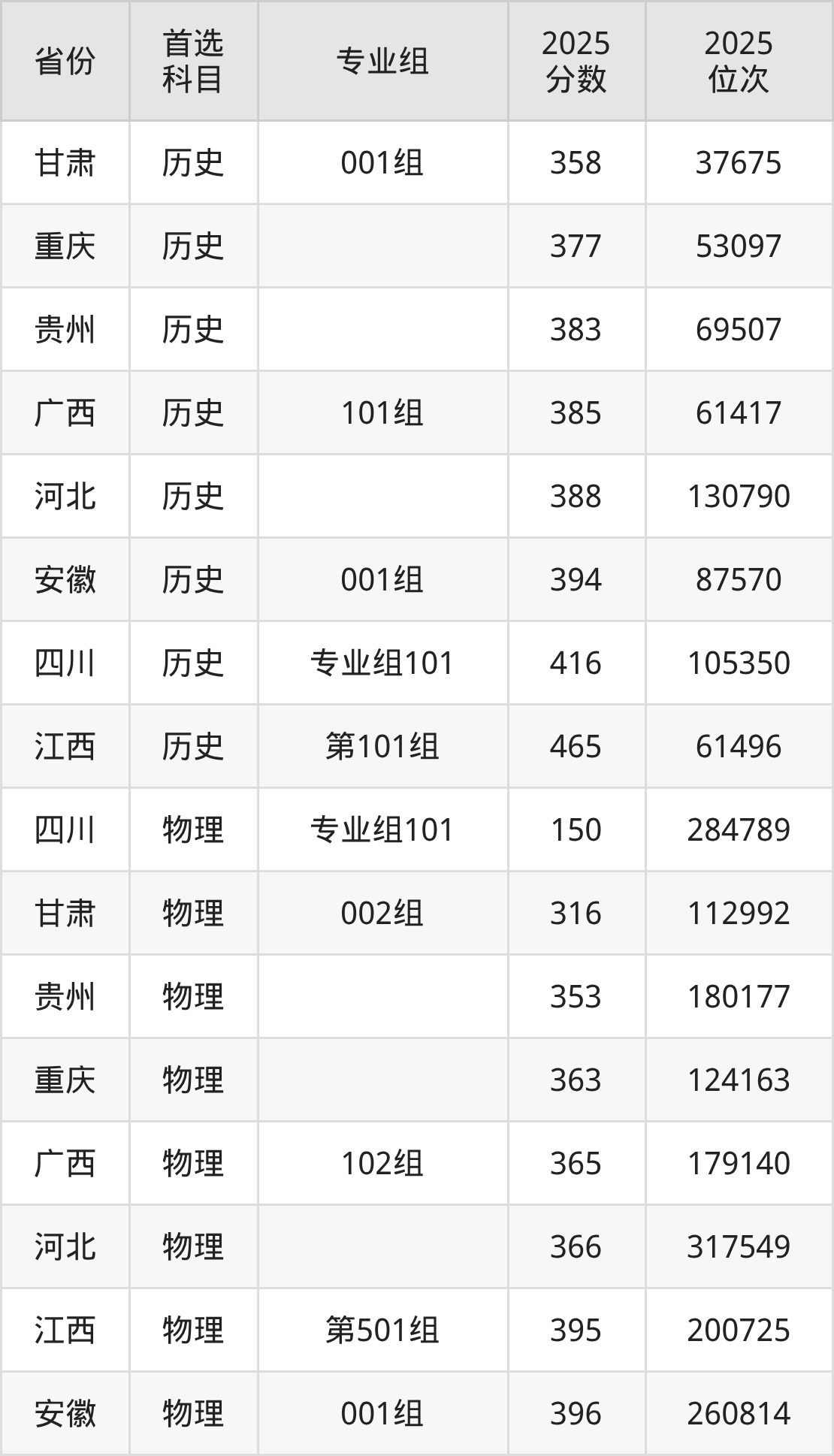 历史类最低分对应地区为甘肃(001组),录取位次为37675,超专科线198分;最高分对应地区为江西(第101组),录取位次为61496,超专科线175分。