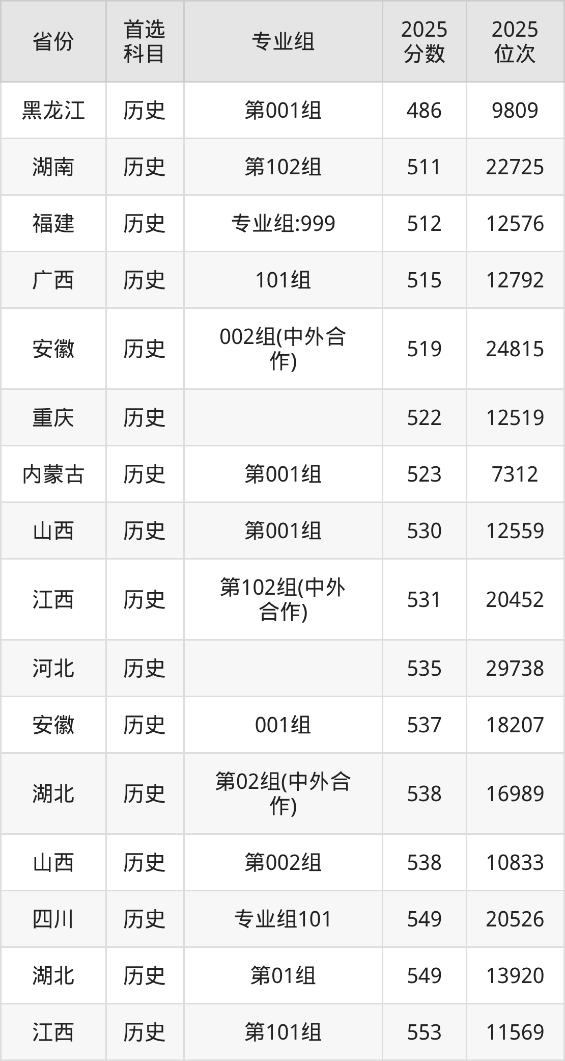 历史类:001组537分、18207名,002组(中外合作)519分、24815名;