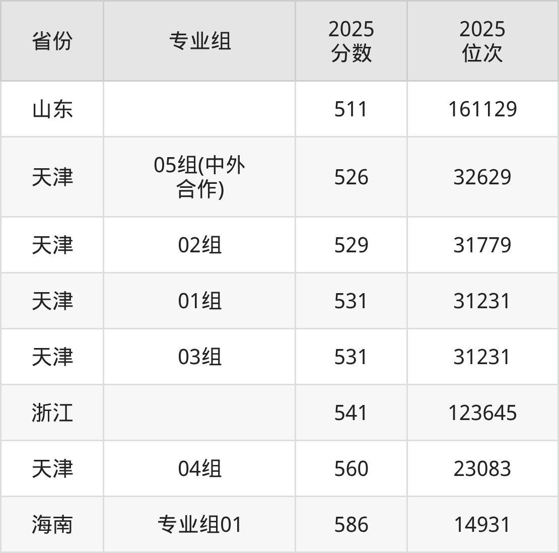 最低分对应地区为山东,录取位次为161129;最高分对应地区为海南(专业组01),录取位次为14931,超本科线106分。