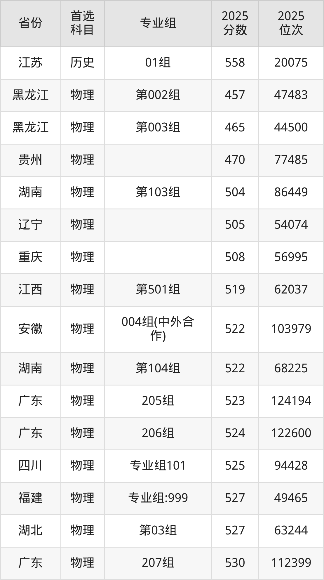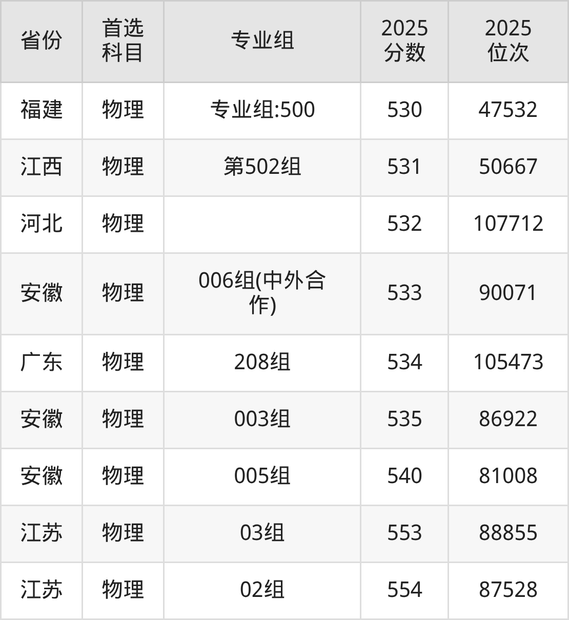 物理类:003组535分、86922名,004组(中外合作)522分、103979名,005组540分、81008名,006组(中外合作)533分、90071名;