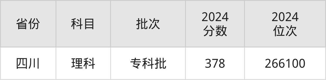 理科最低分对应地区为四川,录取位次为266100,超专科线228分。