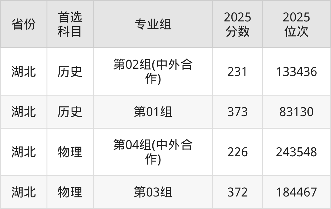 历史类最低分对应地区为湖北(第02组(中外合作)),录取位次为133436,超专科线31分;最高分对应地区为湖北(第01组),录取位次为83130,超专科线173分。