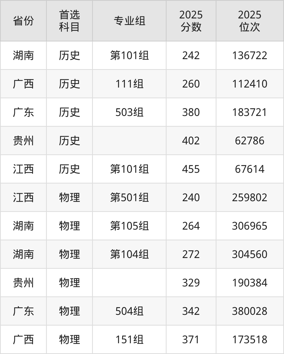 历史类最低分对应地区为湖南(第101组),录取位次为136722,超专科线42分;最高分对应地区为江西(第101组),录取位次为67614,超专科线165分。
