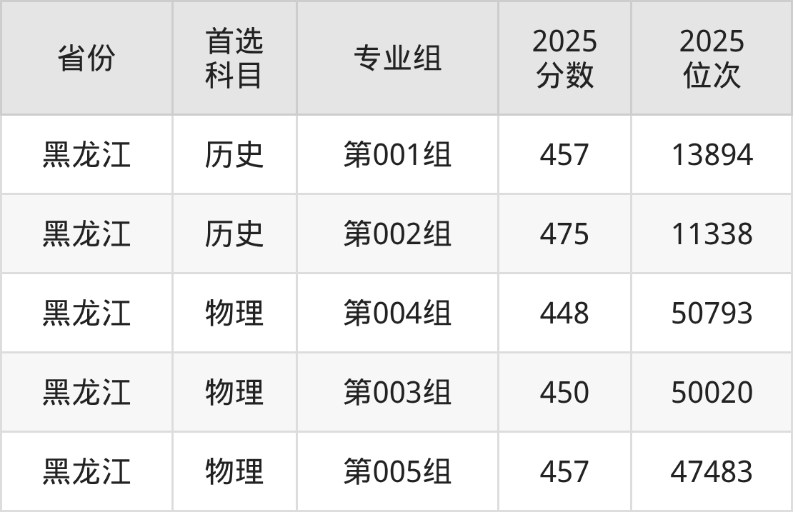 历史类最低分对应地区为黑龙江(第001组),录取位次为13894,超本科线52分;最高分对应地区为黑龙江(第002组),录取位次为11338。
