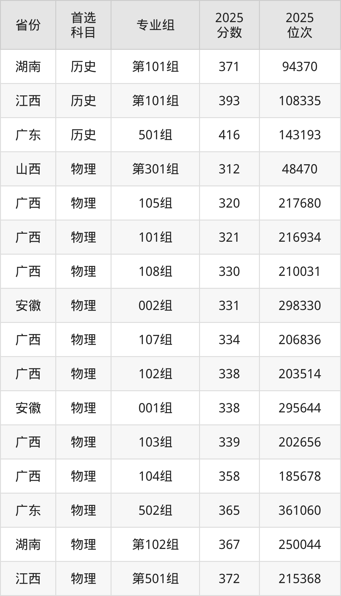 物理类最低分对应地区为山西(第301组),录取位次为48470,超专科线212分;最高分对应地区为江西(第502组),录取位次为205039,超专科线149分。