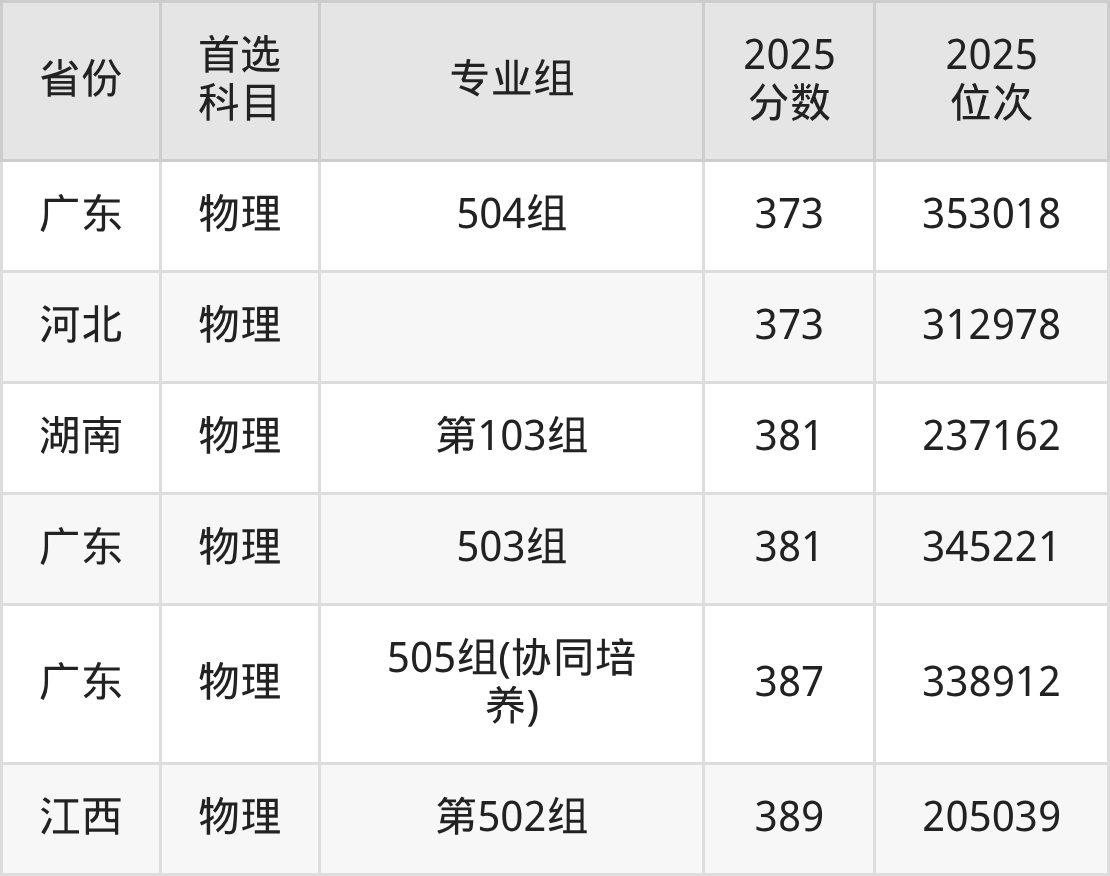 物理类:502组365分、361060名,503组381分、345221名,504组373分、353018名,505组(协同培养)387分、338912名;