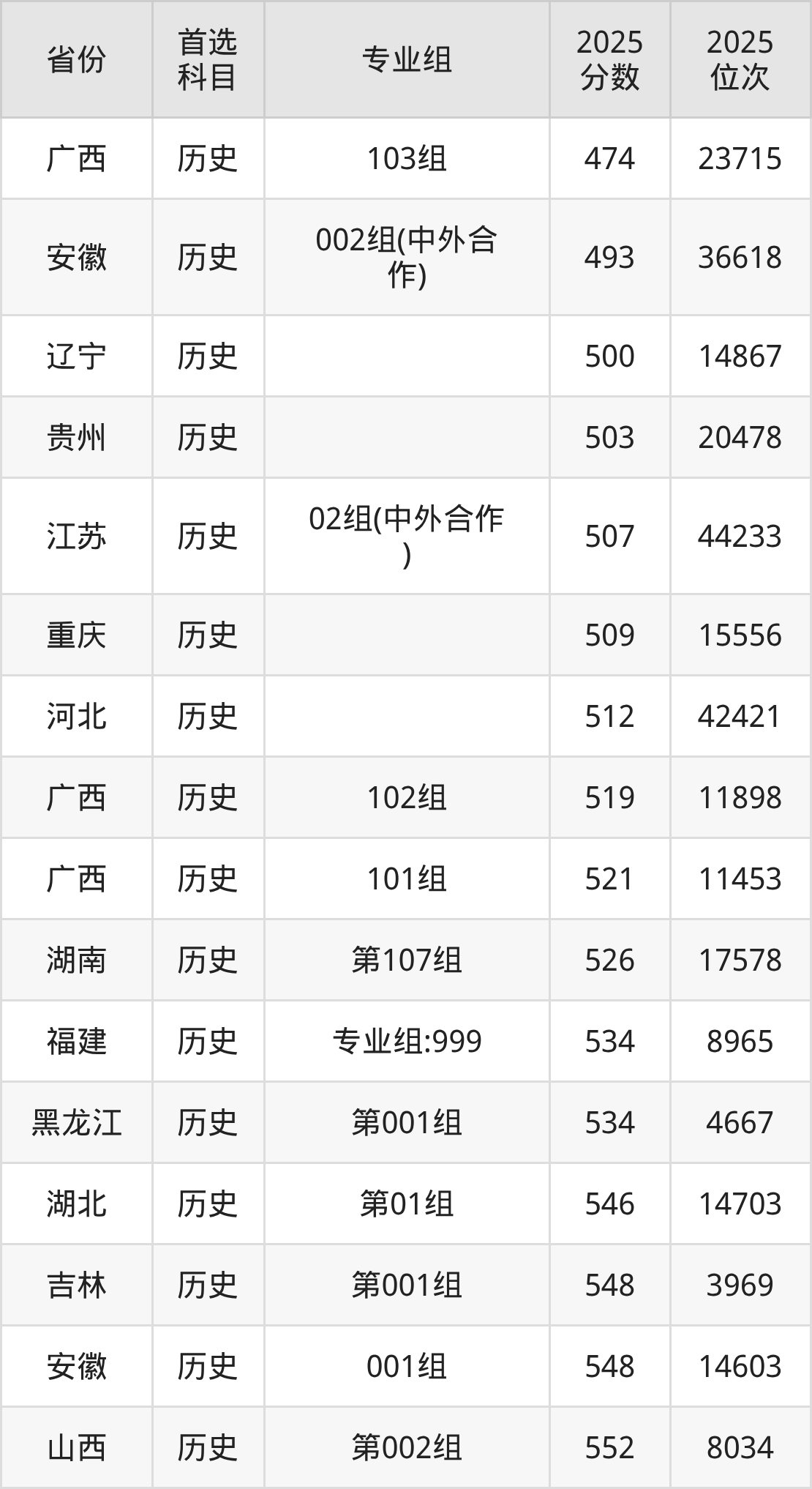 历史类最低分对应地区为广西(103组),录取位次为23715,超本科线72分;最高分对应地区为山西(第001组),录取位次为6026,超本科线121分。