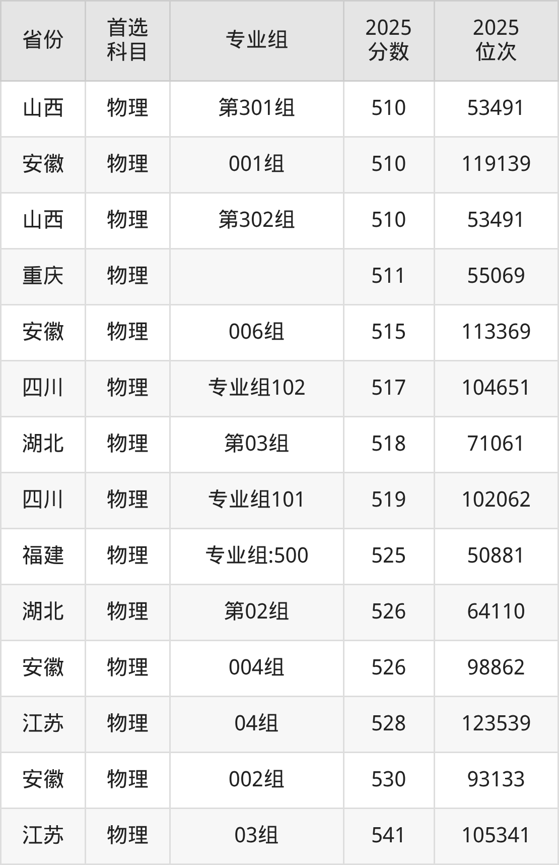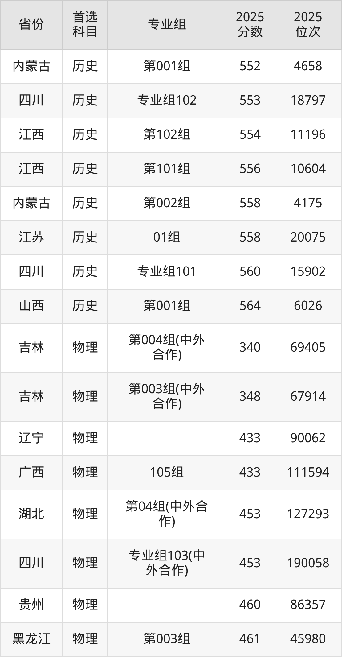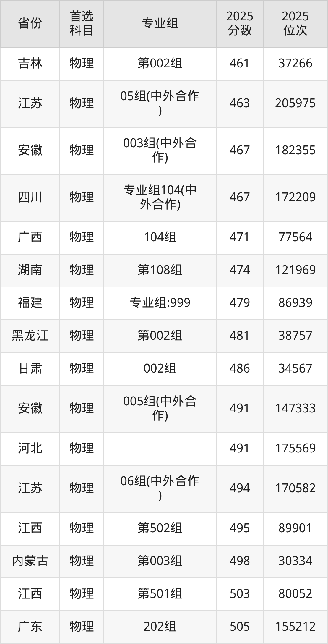 物理类最低分对应地区为吉林(第004组(中外合作)),录取位次为69405;最高分对应地区为江苏(03组),录取位次为105341,超本科线78分。
