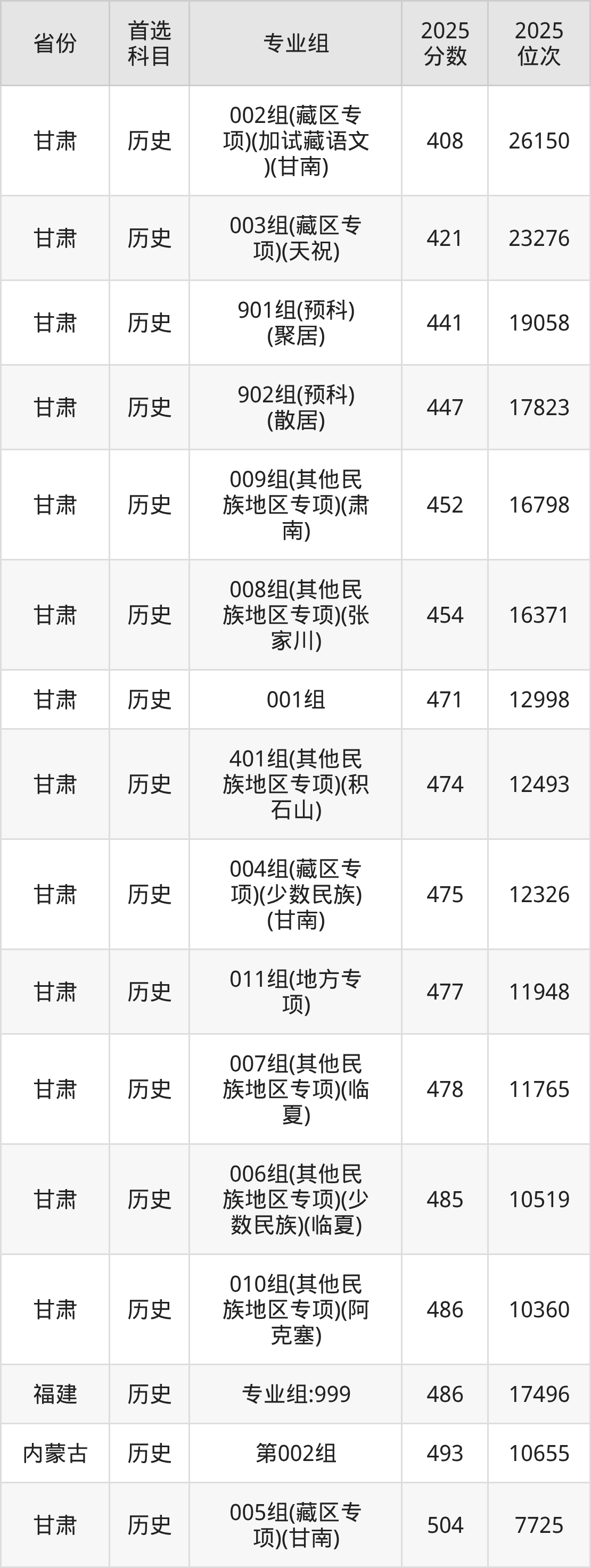 历史类:001组484分、11696名,003组(藏区专项)(加试藏语文)(甘南)400分、29181名,004组(藏区专项)(天祝)427分、22895名,005组(其他民族地区专项)(积石山县)410分、26769名,006组(藏区专项)(少数民族)(甘南)474分、13465名,007组(藏区专项)(甘南)494分、10027名,008组(其他民族地区专项)(少数民族)(临夏)478分、12713名,009组(其他民族地区专项)(临夏)484分、11696名,010组(其他民族地区专项)(张家川)474分、13465名,011组(其他民族地区专项)(肃南)489分、10818名,012组(其他民族地区专项)(肃北)457分、16526名,013组(其他民族地区专项)(阿克塞)490分、10636名,014组(地方专项)465分、15073名,901组(预科)(聚居)438分、20417名,902组(预科)(散居)467分、14706名;
