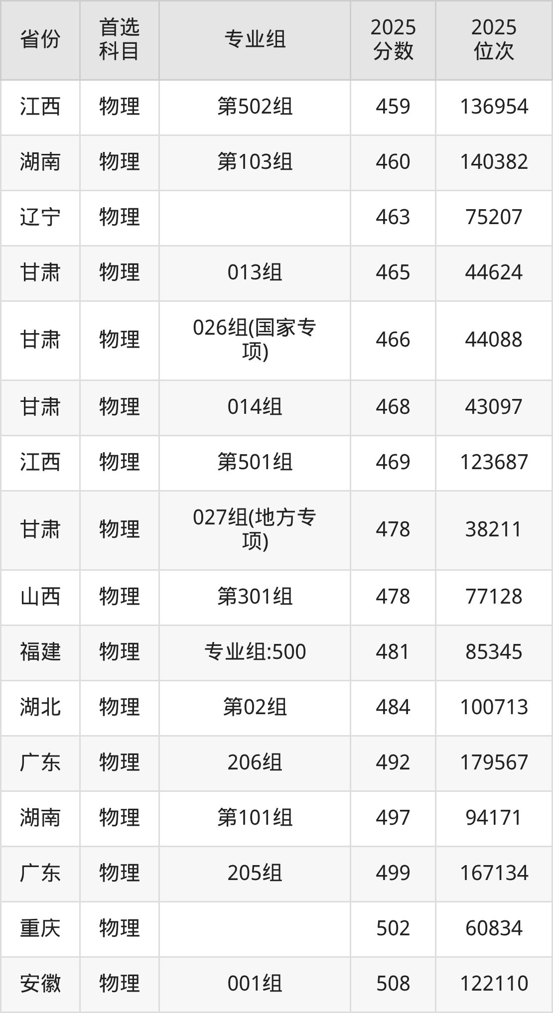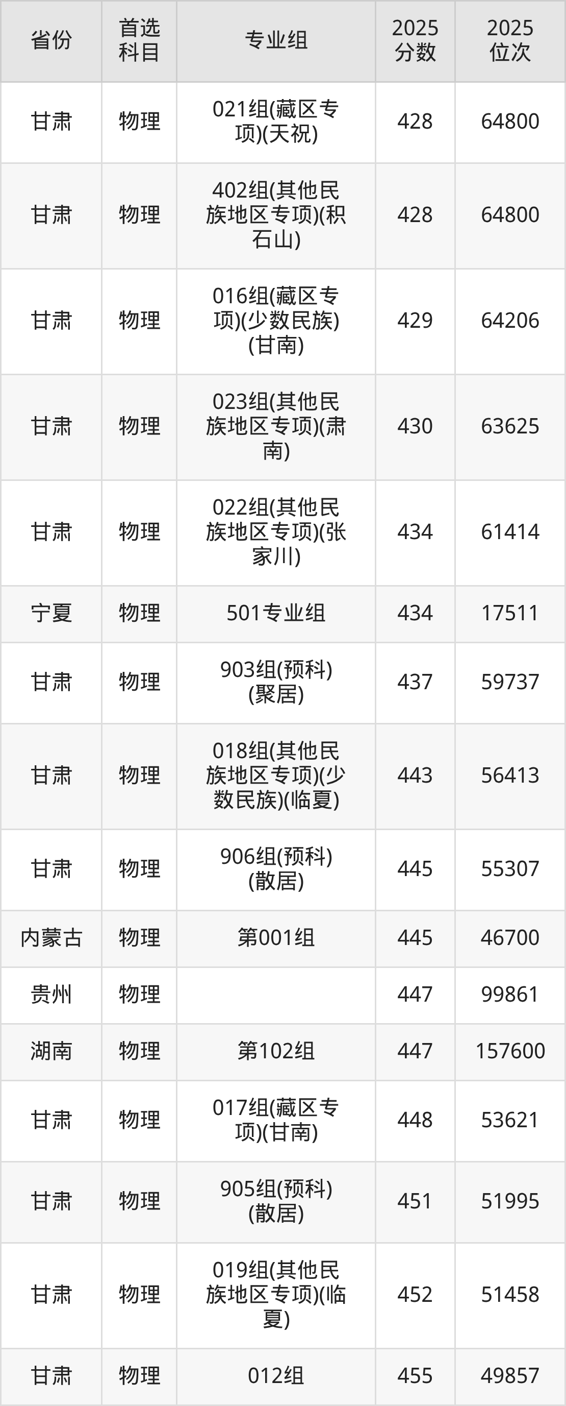 物理类:012组455分、49857名,013组465分、44624名,014组468分、43097名,015组(藏区专项)(加试藏语文)(甘南)380分、90931名,016组(藏区专项)(少数民族)(甘南)429分、64206名,017组(藏区专项)(甘南)448分、53621名,018组(其他民族地区专项)(少数民族)(临夏)443分、56413名,019组(其他民族地区专项)(临夏)452分、51458名,020组(藏区专项)(加试藏语文)(天祝)350分、103598名,021组(藏区专项)(天祝)428分、64800名,022组(其他民族地区专项)(张家川)434分、61414名,023组(其他民族地区专项)(肃南)430分、63625名,024组(其他民族地区专项)(肃北)362分、99040名,025组(其他民族地区专项)(阿克塞)419分、69925名,026组(国家专项)466分、44088名,027组(地方专项)478分、38211名,402组(其他民族地区专项)(积石山)428分、64800名,903组(预科)(聚居)437分、59737名,904组(预科)(聚居)416分、71627名,905组(预科)(散居)451分、51995名,906组(预科)(散居)445分、55307名;