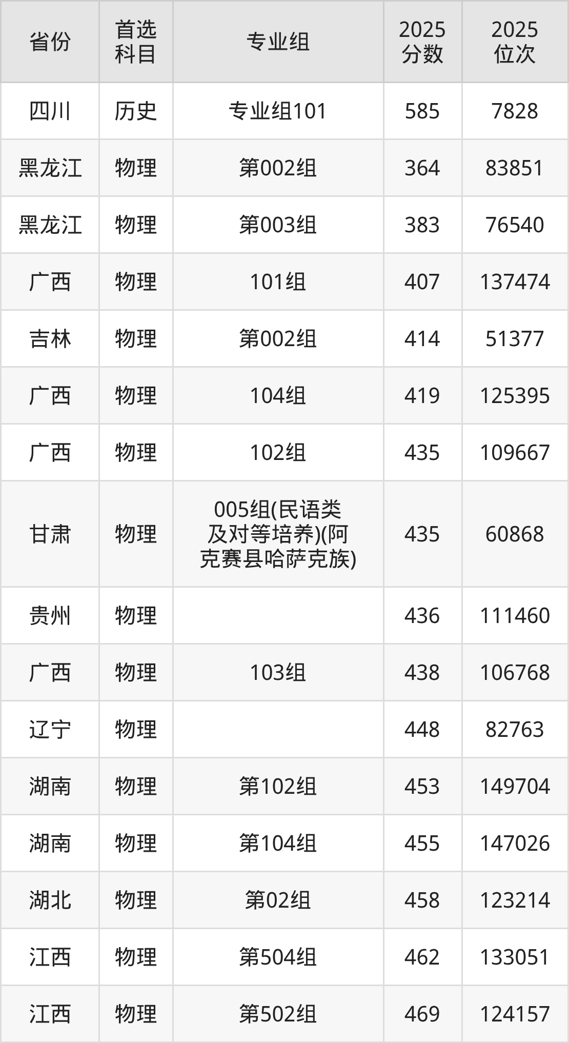 理科最低分对应地区为新疆,录取位次为25135,超二本线101分;最高分对应地区为新疆,录取位次为18415。