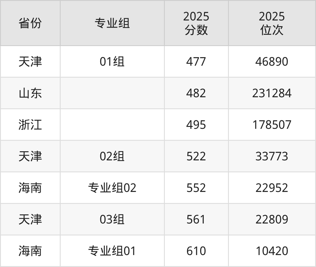 最低分对应地区为天津(01组),录取位次为46890,超本科线1分;最高分对应地区为海南(专业组01),录取位次为10420。
