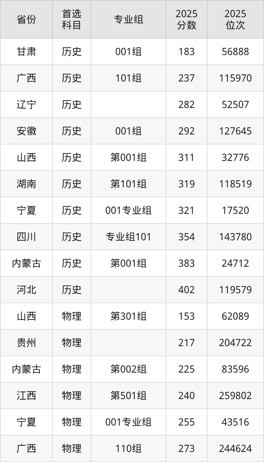 历史类最低分对应地区为甘肃(001组),录取位次为56888,超专科线23分;最高分对应地区为河北,录取位次为119579,超专科线202分。