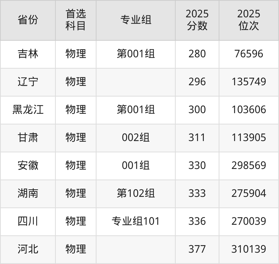 物理类最低分对应地区为山西(第301组),录取位次为62089,超专科线53分;最高分对应地区为河北,录取位次为310139,超专科线177分。
