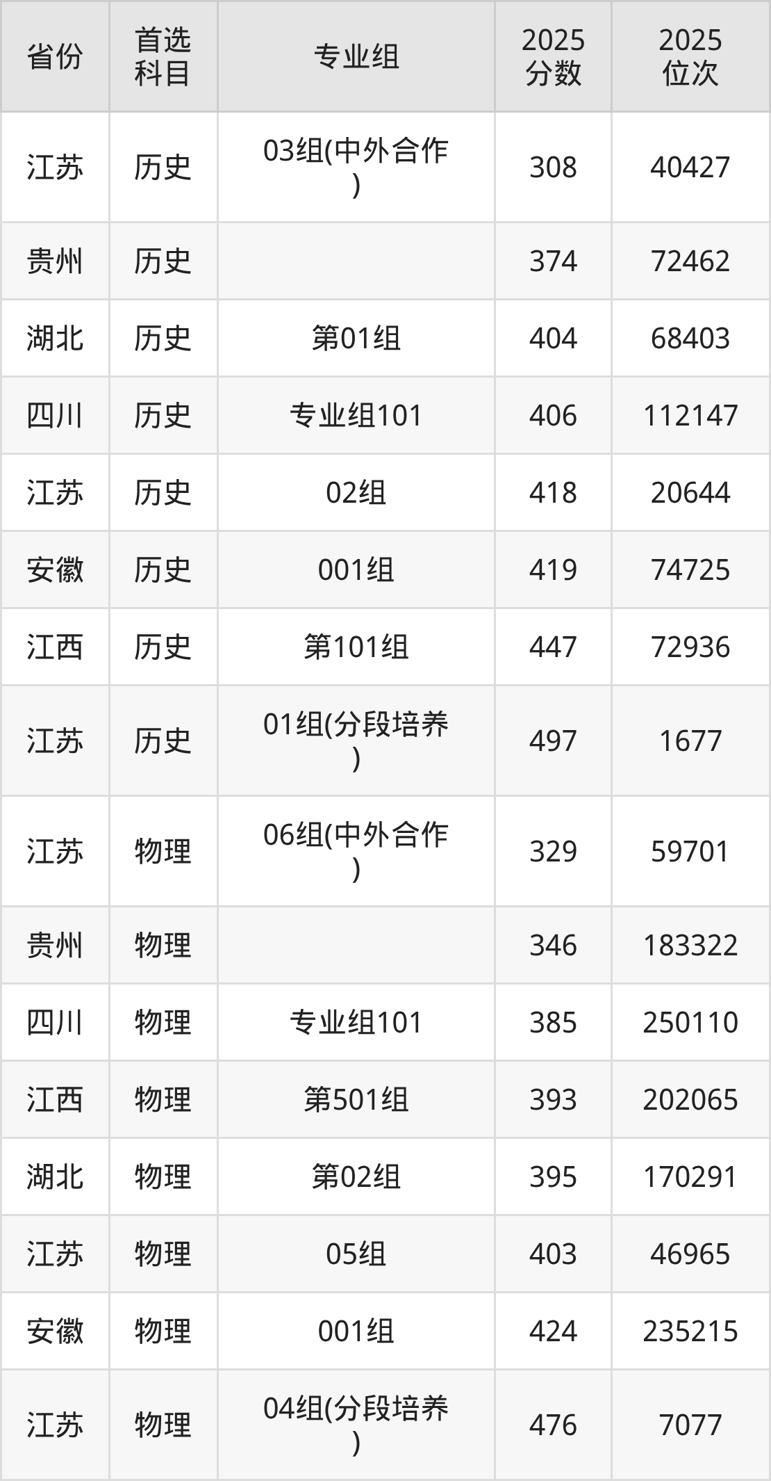物理类:04组(分段培养)476分、7077名,05组403分、46965名,06组(中外合作)329分、59701名;