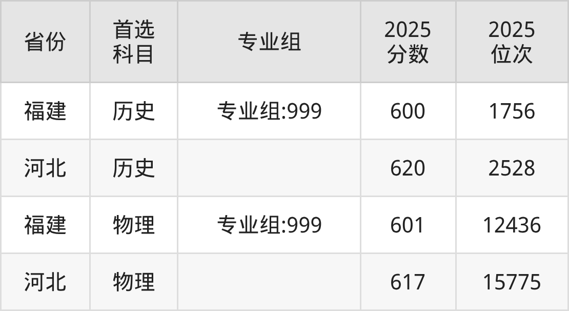 历史类最低分对应地区为福建(专业组:999),录取位次为1756;最高分对应地区为河北,录取位次为2528,超本科线143分。