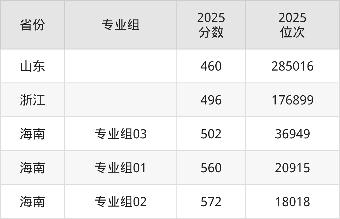 最低分对应地区为山东,录取位次为285016,超一段线67分;最高分对应地区为海南(专业组02),录取位次为18018,超本科线92分。