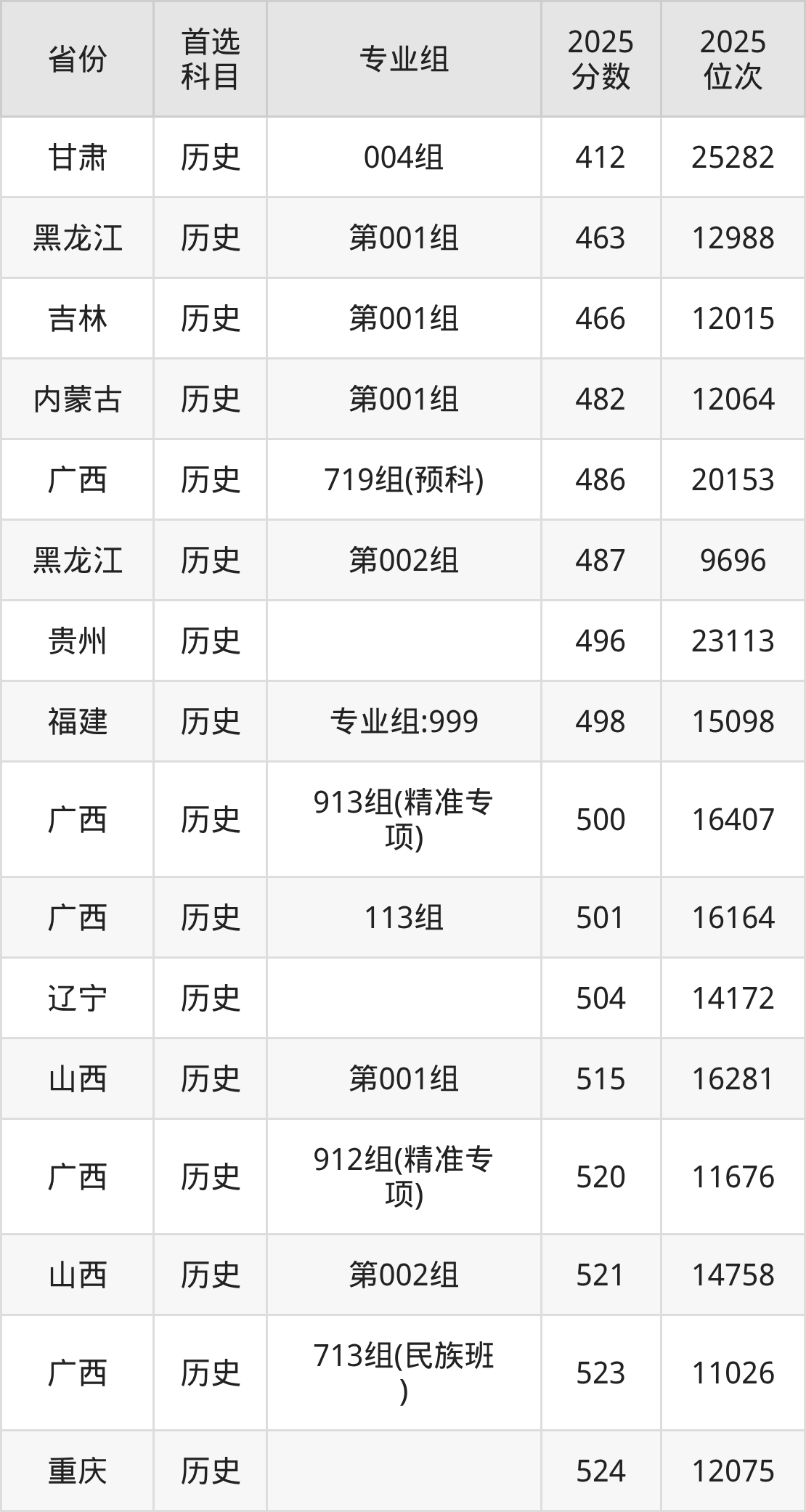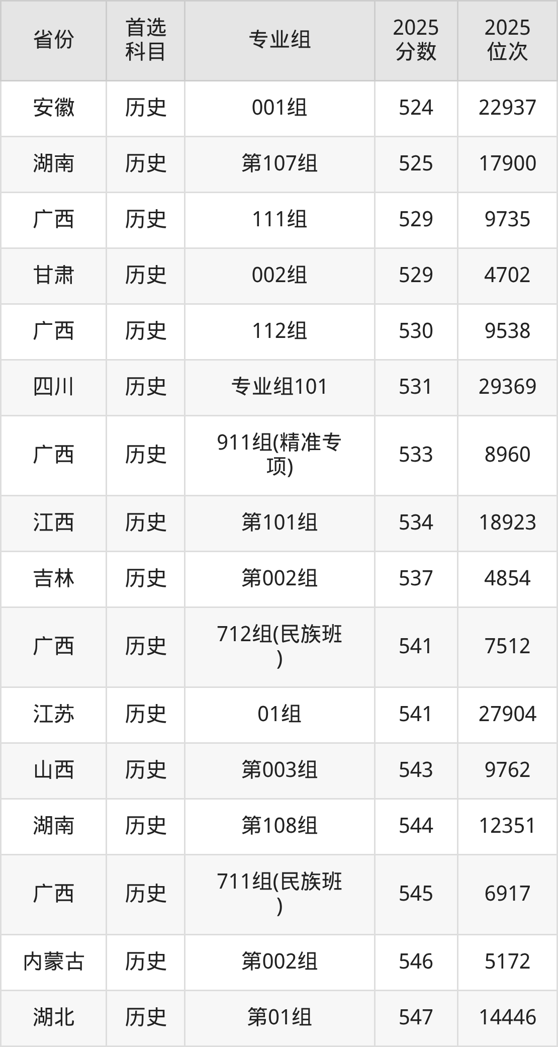 历史类:111组529分、9735名,112组530分、9538名,113组501分、16164名,711组(民族班)545分、6917名,712组(民族班)541分、7512名,713组(民族班)523分、11026名,719组(预科)486分、20153名,911组(精准专项)533分、8960名,912组(精准专项)520分、11676名,913组(精准专项)500分、16407名;
