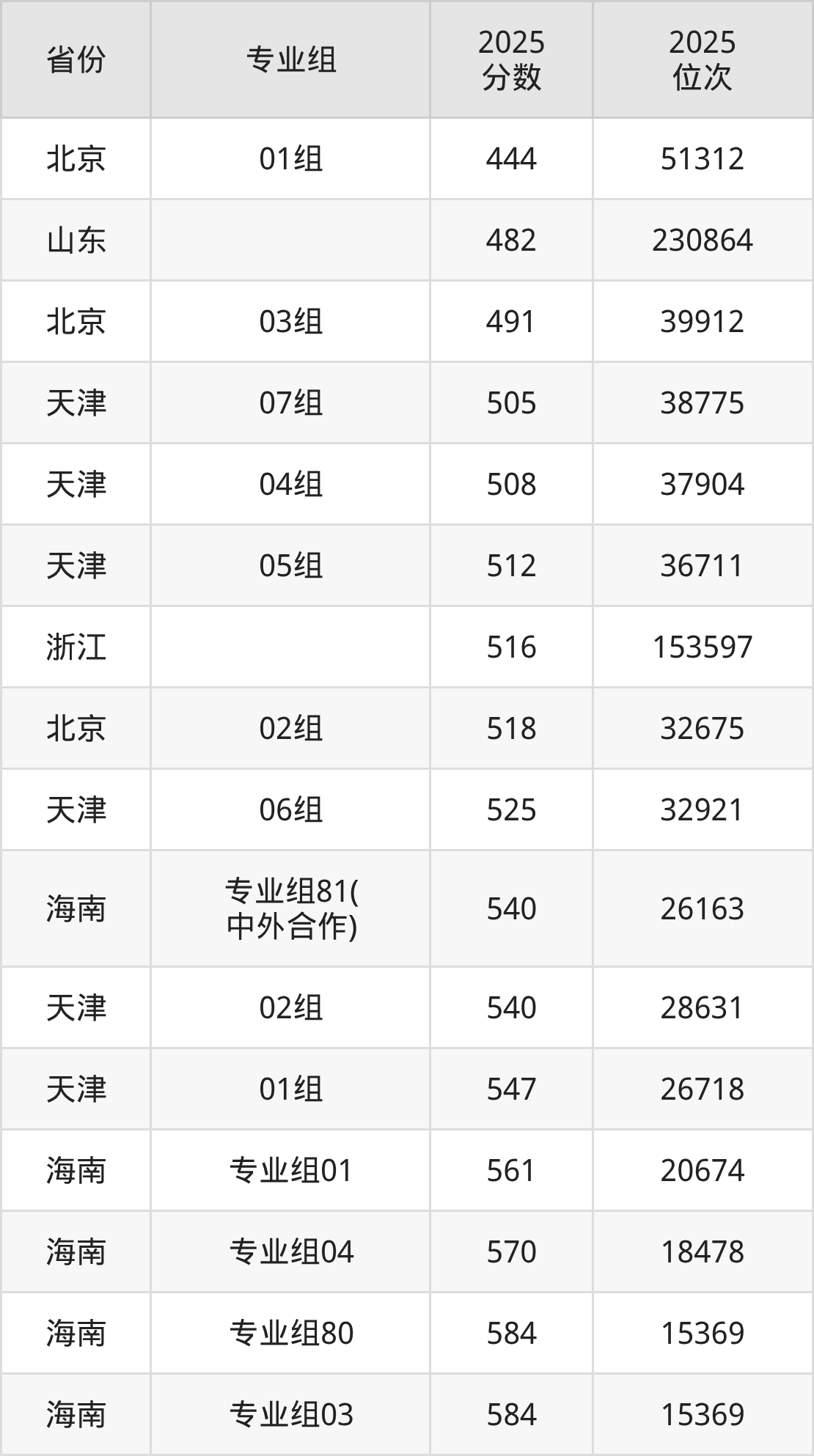 最低分对应地区为北京(01组),录取位次为51312,超本科线14分;最高分对应地区为海南(专业组05),录取位次为6465,超本科线158分。