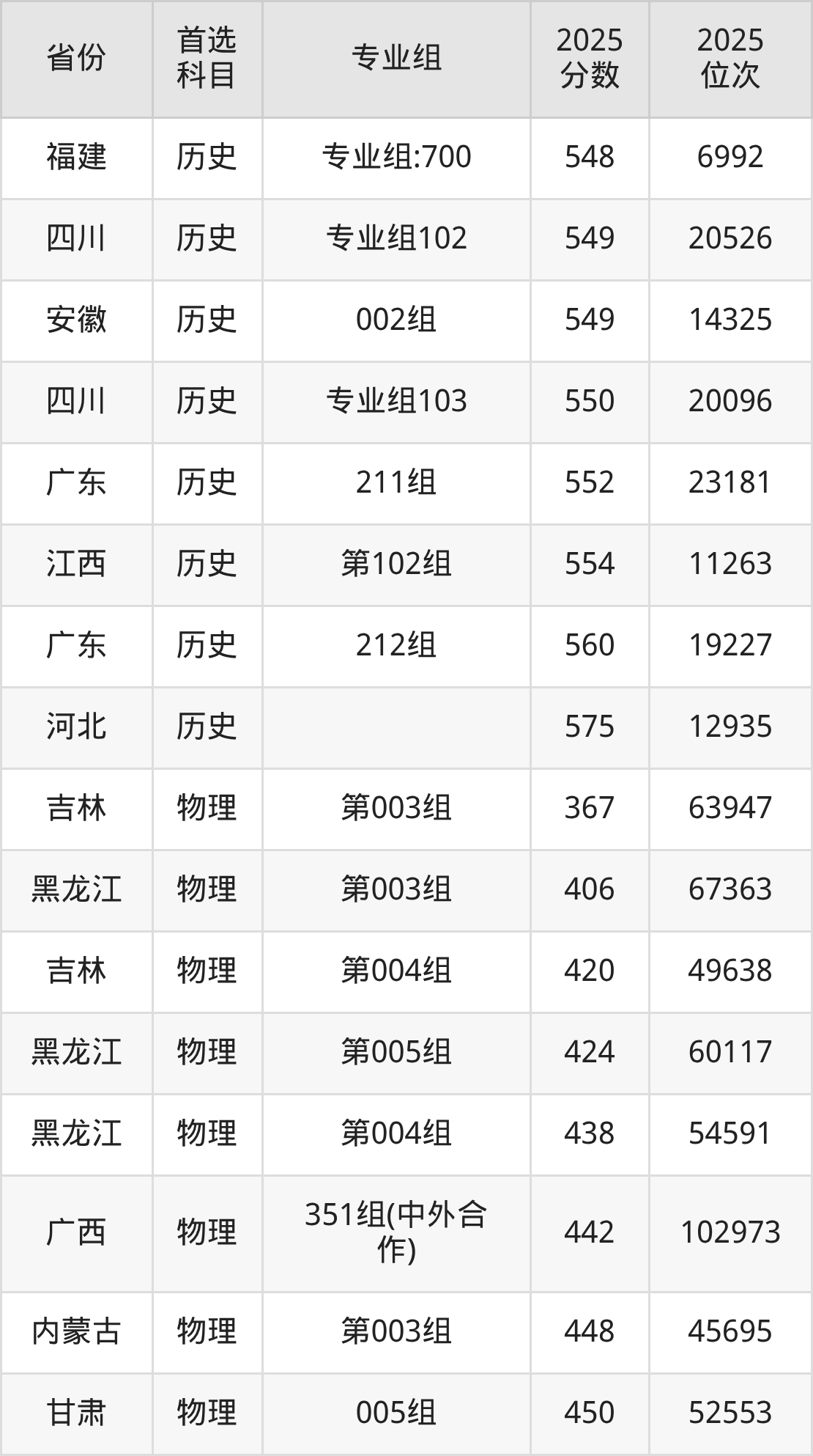 历史类最低分对应地区为甘肃(004组),录取位次为25282;最高分对应地区为河北,录取位次为12935,超本科线98分。
