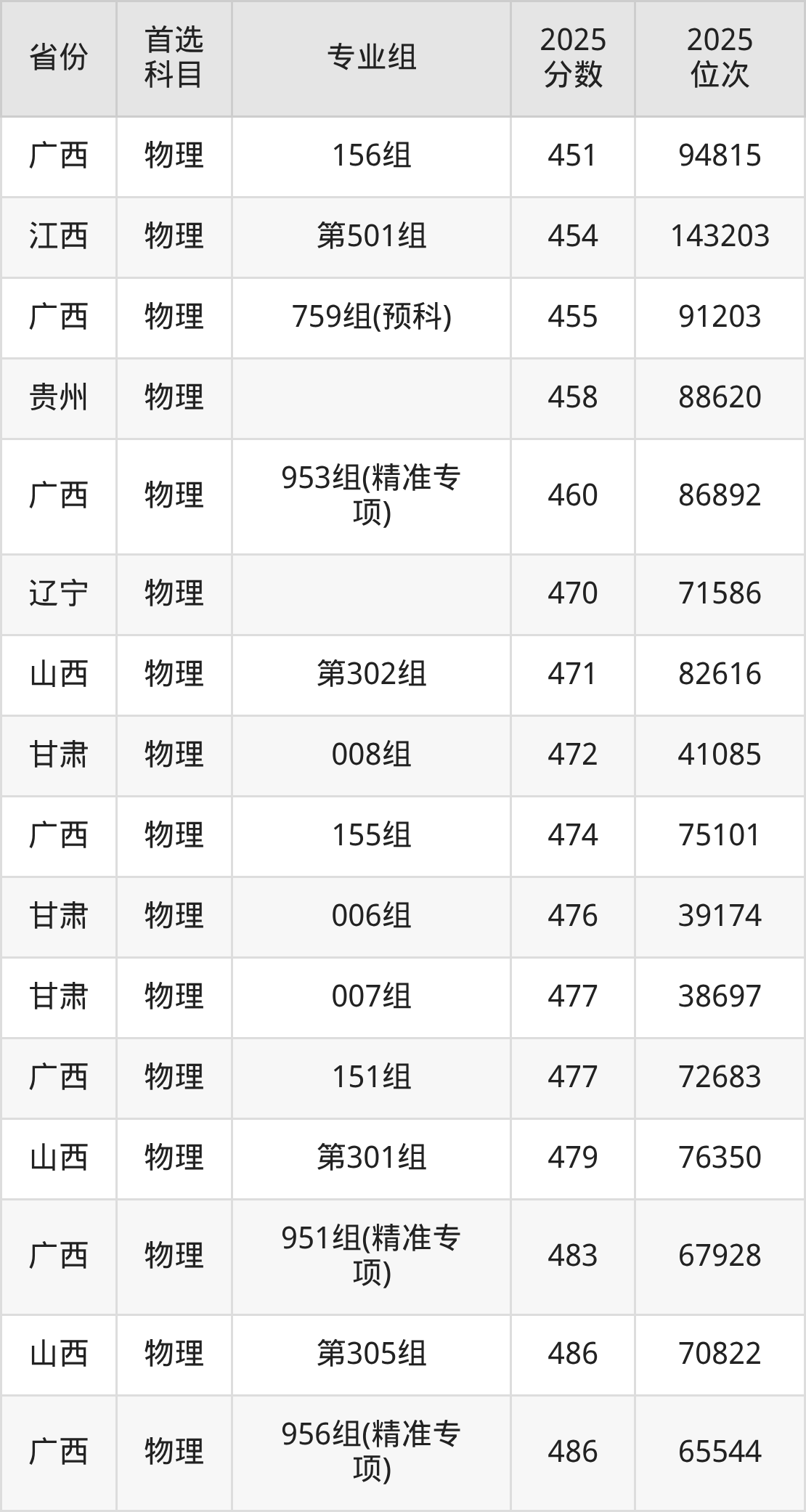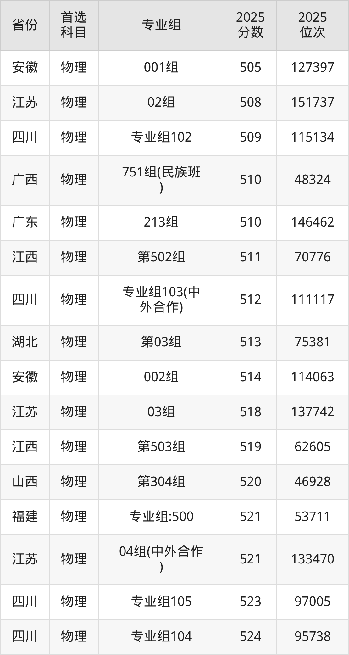 物理类:151组486分、65357名,153组503分、53860名,154组505分、52542名,156组469分、78348名,351组(中外合作)442分、99217名,751组(民族班)523分、40773名,753组(民族班)509分、49941名,754组(民族班)522分、41743名,756组(民族班)485分、66477名,759组(预科)467分、79688名,951组(精准专项)488分、64085名,953组(精准专项)510分、48936名,954组(精准专项)493分、60434名,956组(精准专项)465分、80823名;