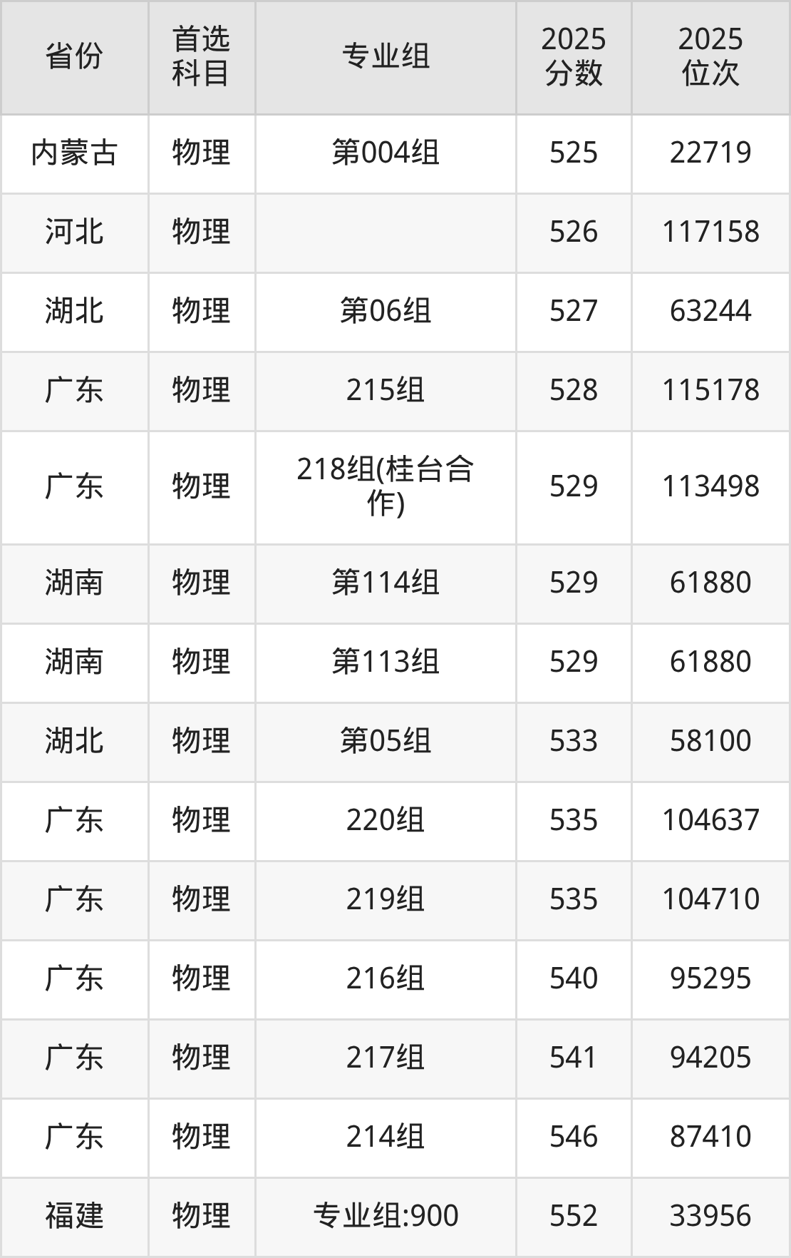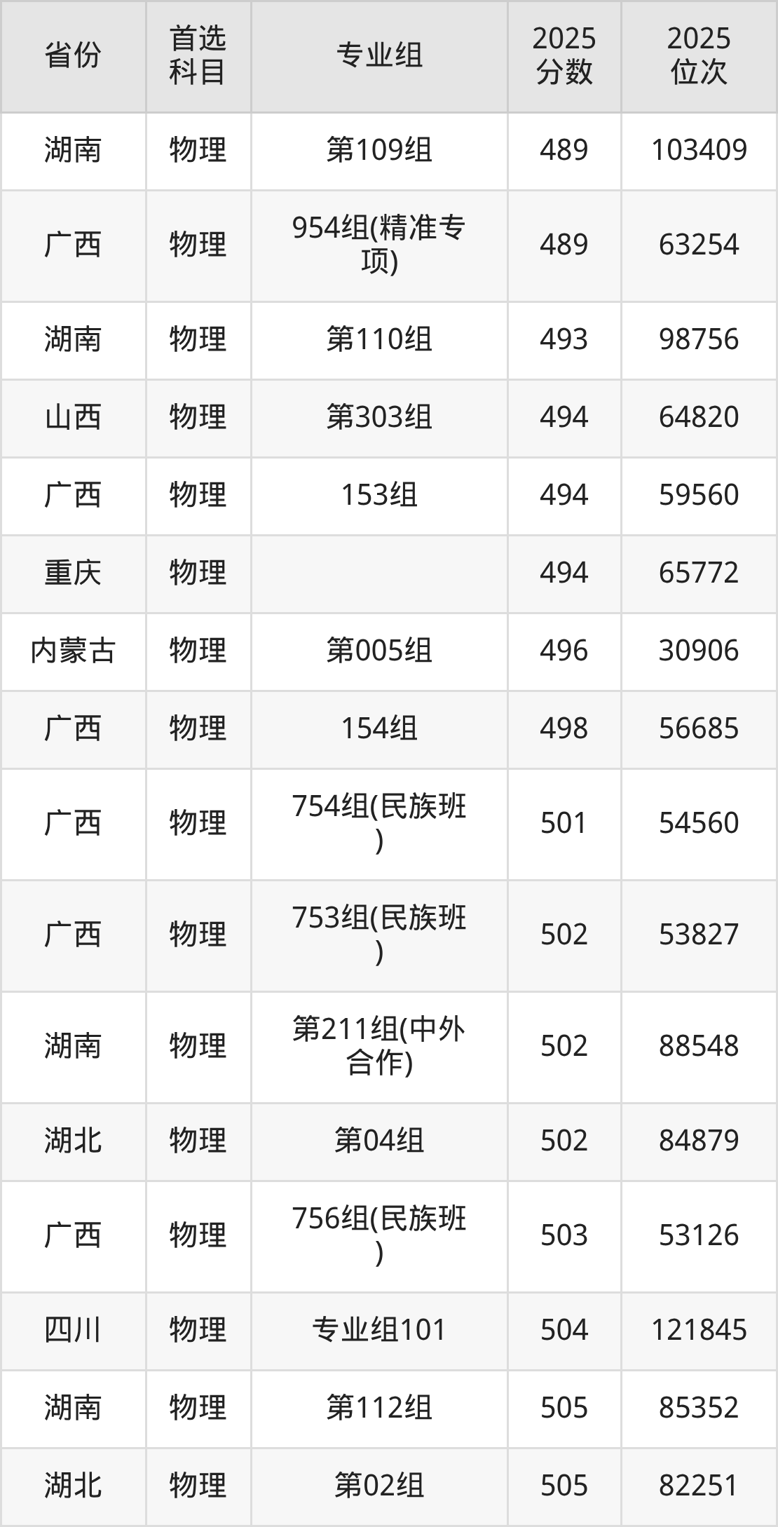 物理类:151组477分、72683名,153组494分、59560名,154组498分、56685名,155组474分、75101名,156组451分、94815名,351组(中外合作)442分、102973名,751组(民族班)510分、48324名,753组(民族班)502分、53827名,754组(民族班)501分、54560名,756组(民族班)503分、53126名,759组(预科)455分、91203名,951组(精准专项)483分、67928名,953组(精准专项)460分、86892名,954组(精准专项)489分、63254名,956组(精准专项)486分、65544名;