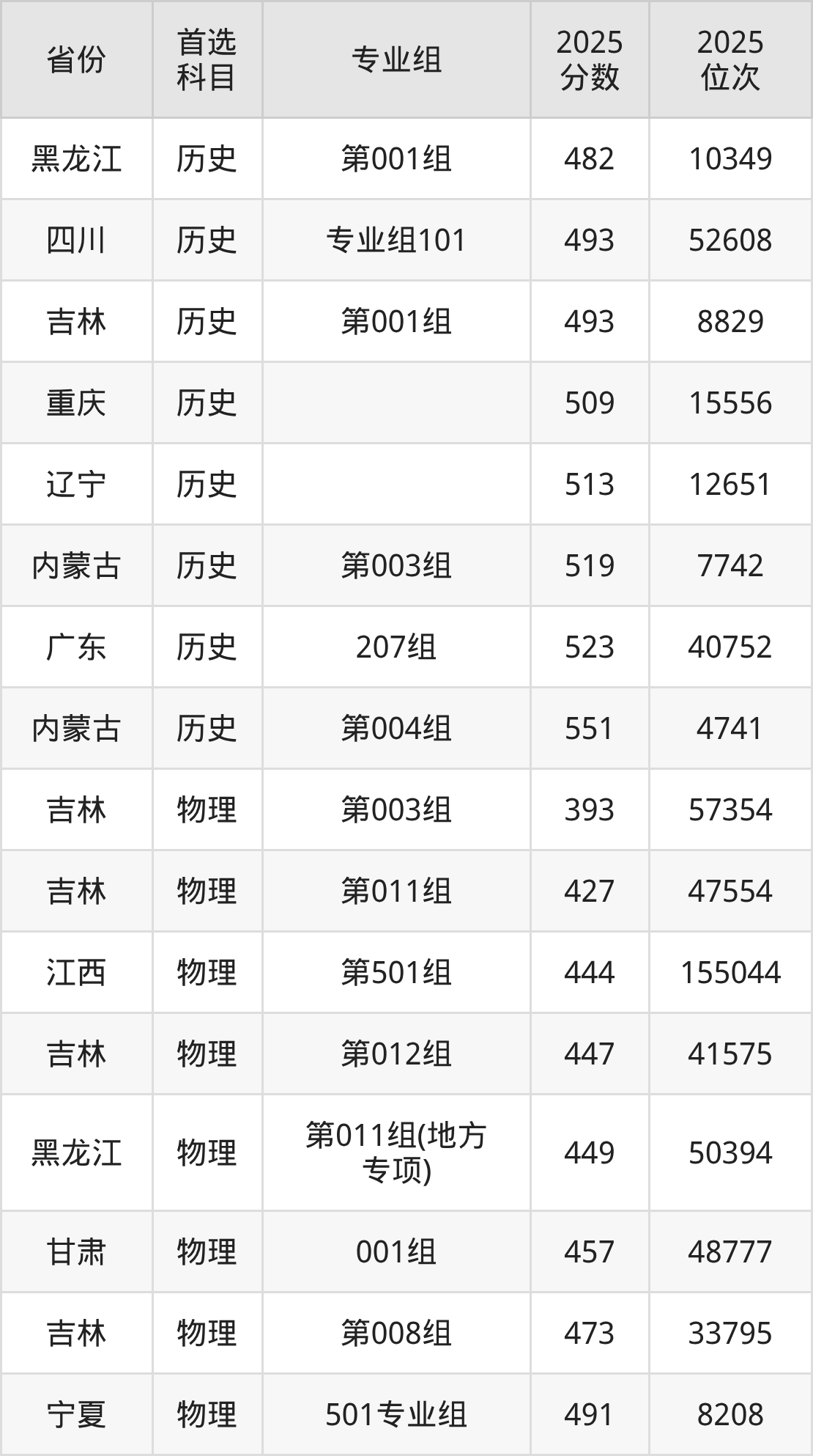 历史类最低分对应地区为黑龙江(第001组),录取位次为10349,超本科线77分;最高分对应地区为内蒙古(第004组),录取位次为4741,超本科线133分。